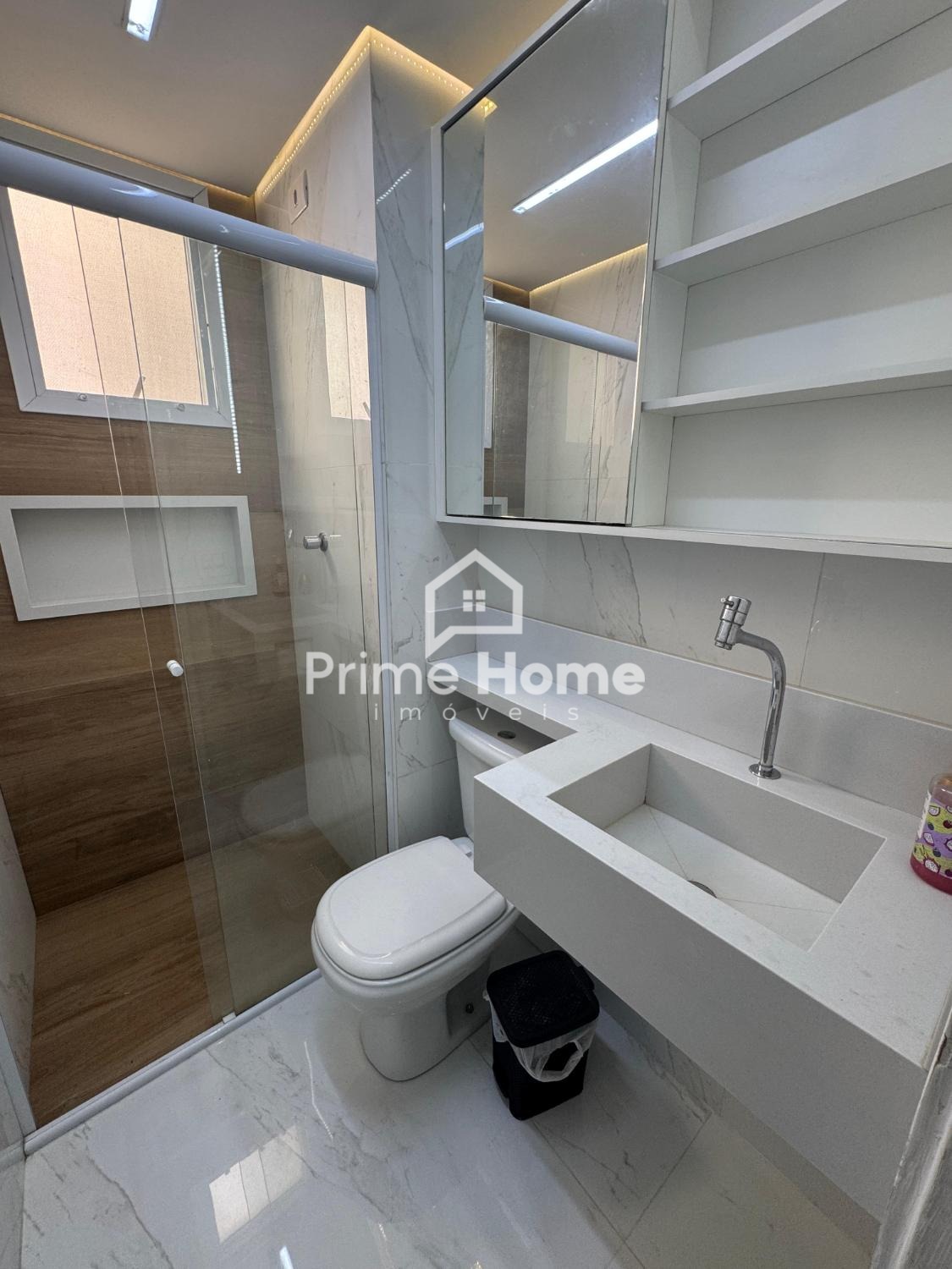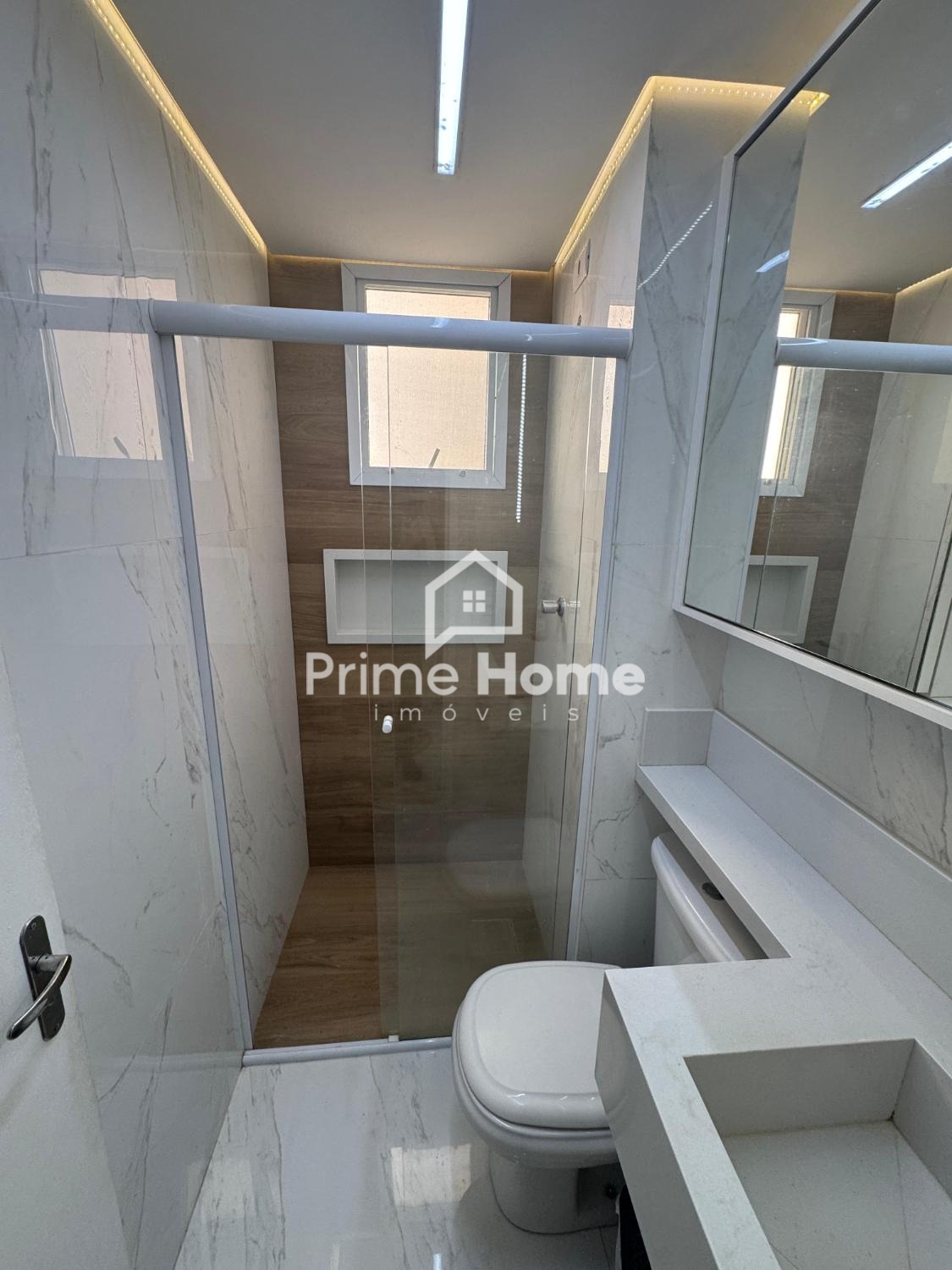 O imóvel conta com dois dormitórios, banheiro com armário planejado, cozinha planejada moderna e funcional, além de sala ampla com parede decorada em tecido, sanca de gesso e teto rebaixado. O piso em porcelanato está presente na sala, dormitórios e corredores, proporcionando um visual uniforme e elegante. As janelas são novas, em alumínio, e o apartamento dispõe de uma vaga de garagem coberta.