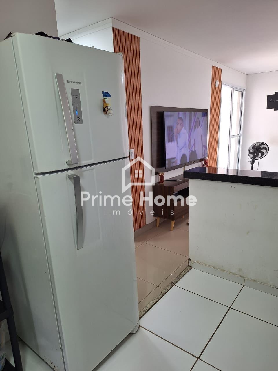 A cozinha é funcional e moderna, com bancada em pedra e equipada com geladeira e Cooktop, integrada à área de serviço, otimizando o espaço. O banheiro social possui armário e box, garantindo comodidade. Todo o apartamento possui piso em porcelanato, trazendo um acabamento elegante e de fácil manutenção.
