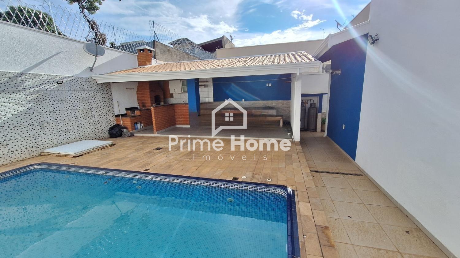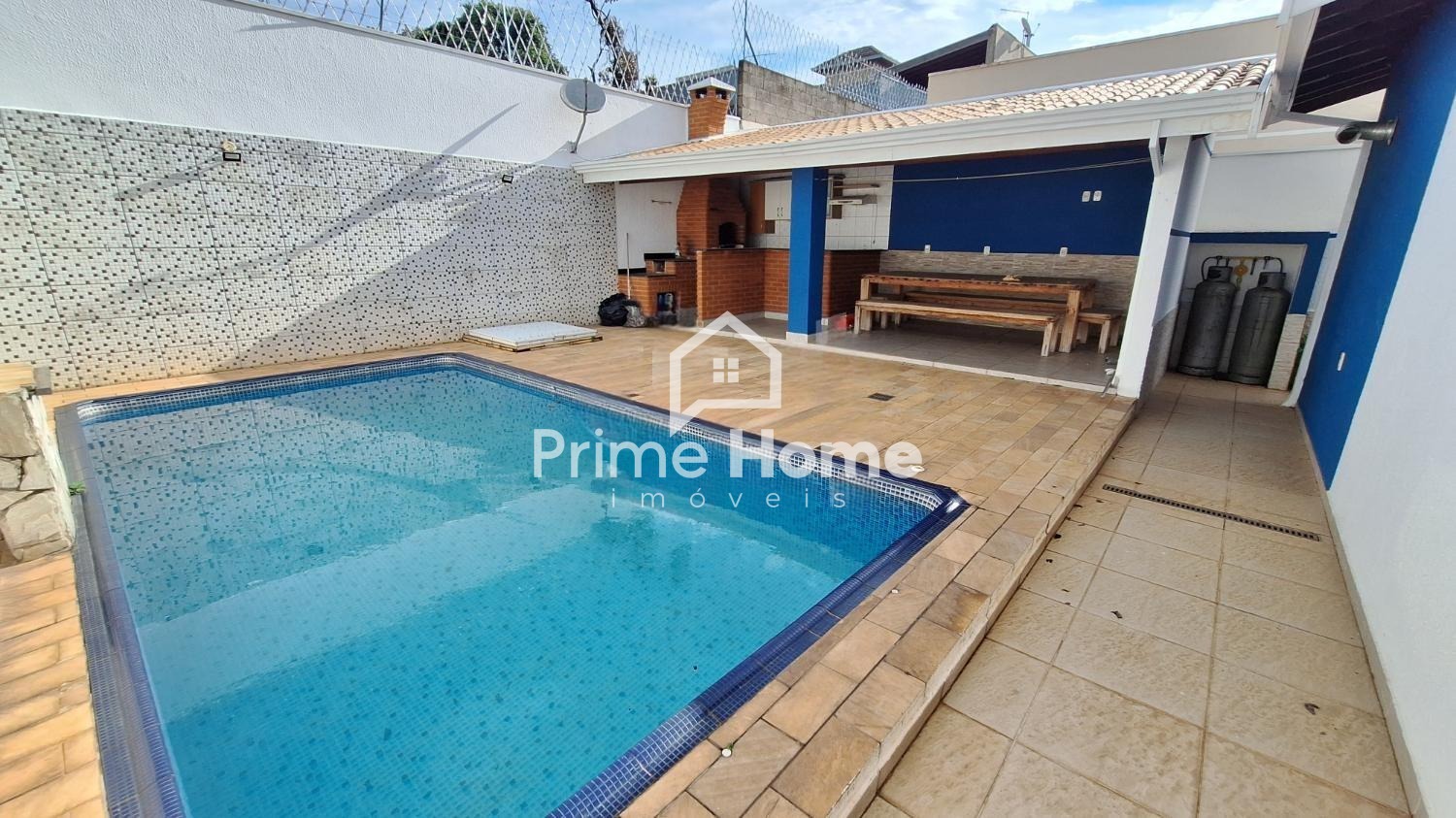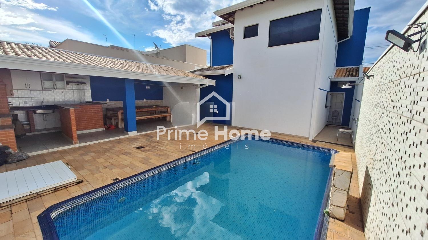 Casa em condomínio em Hortolândia com 185 m² sendo sala de 2 ambientes com sanca de gesso com spots/lâmpadas, cozinha planejada com fogão, exaustor inox e forno, área de serviço, banheiro social, 3 suítes com ar condicionado e persianas, sendo 1 com sacada, escritório, área gourmet com churrasqueira de alvenaria, fogão a lenha, varanda, piscina e banheiro e 4 vagas.