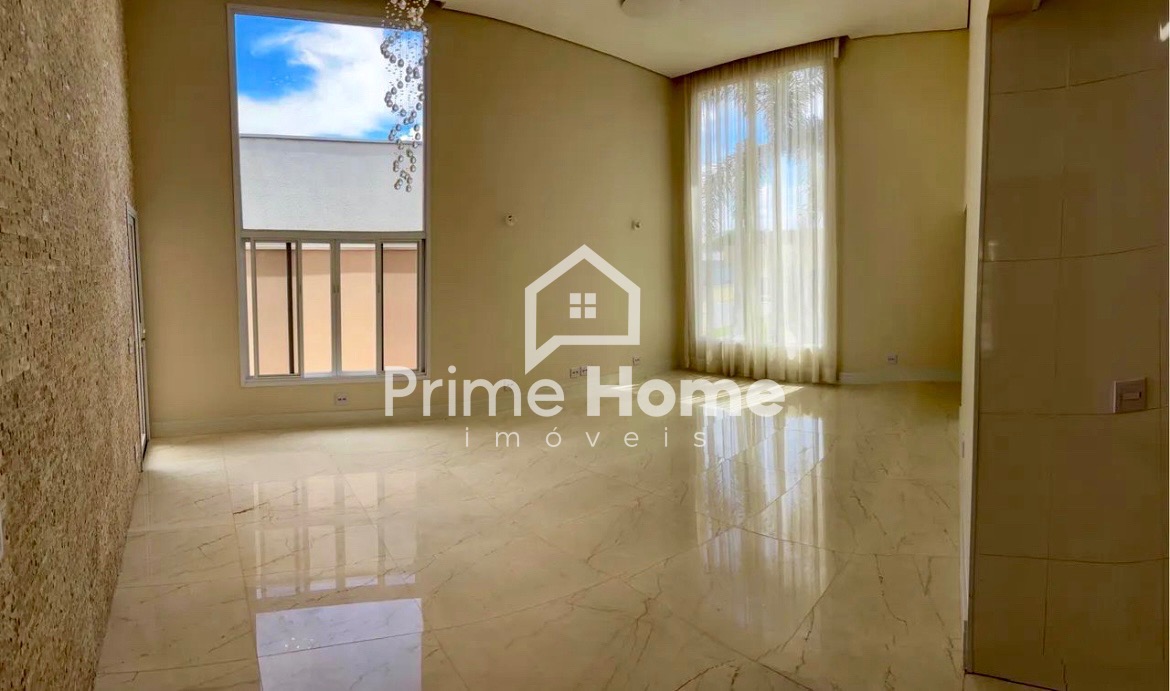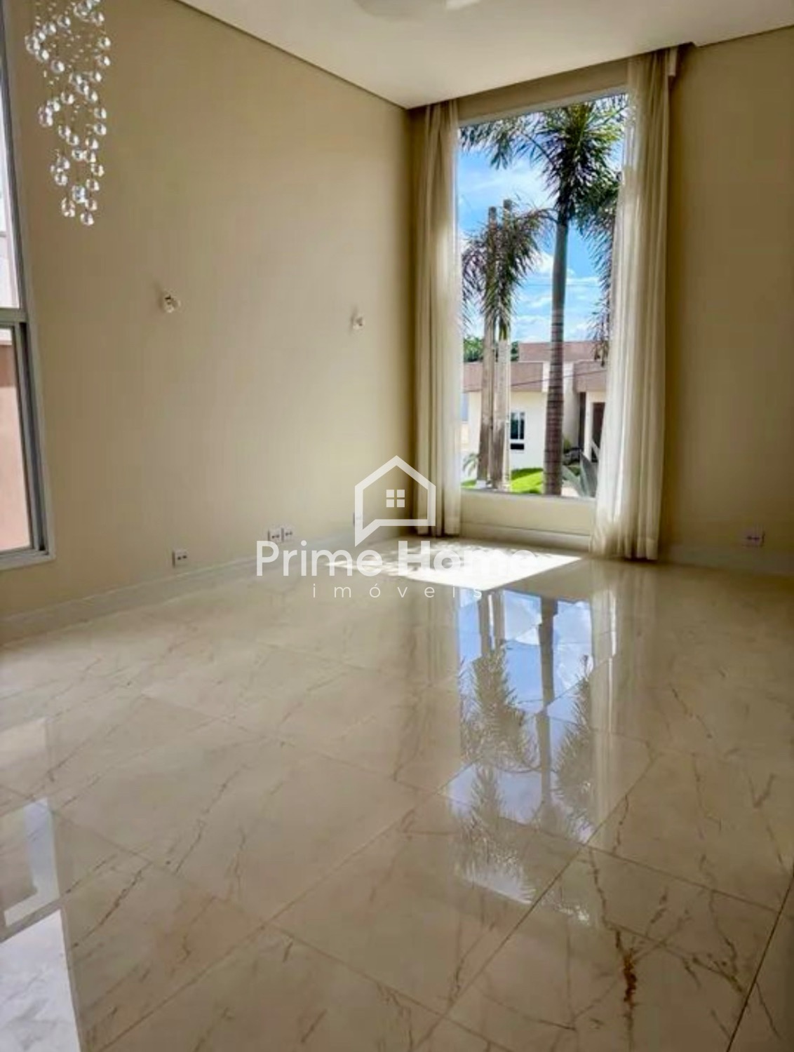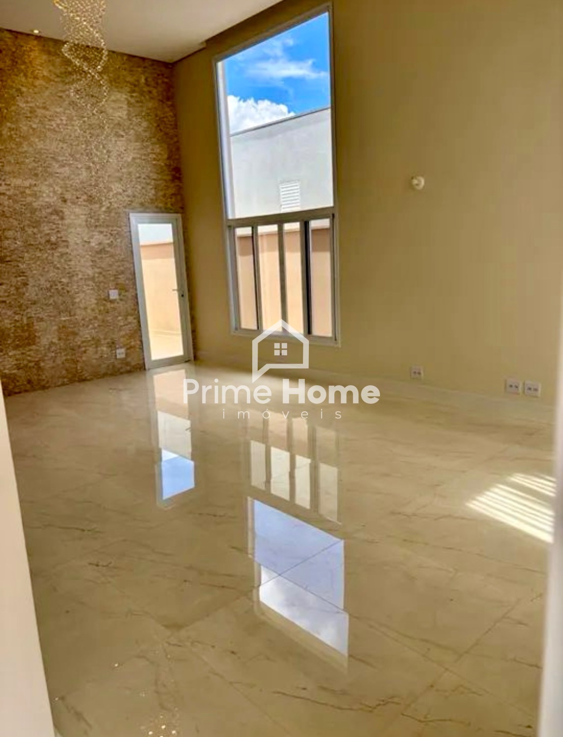 Sala com pé direito duplo, amplas janelas envidraçadas e cortinas elétricas.