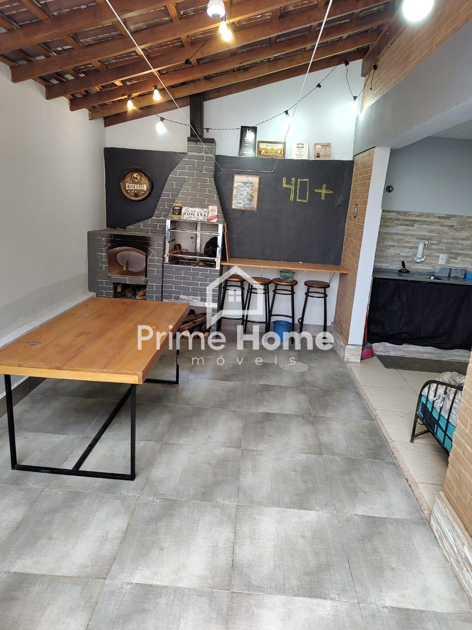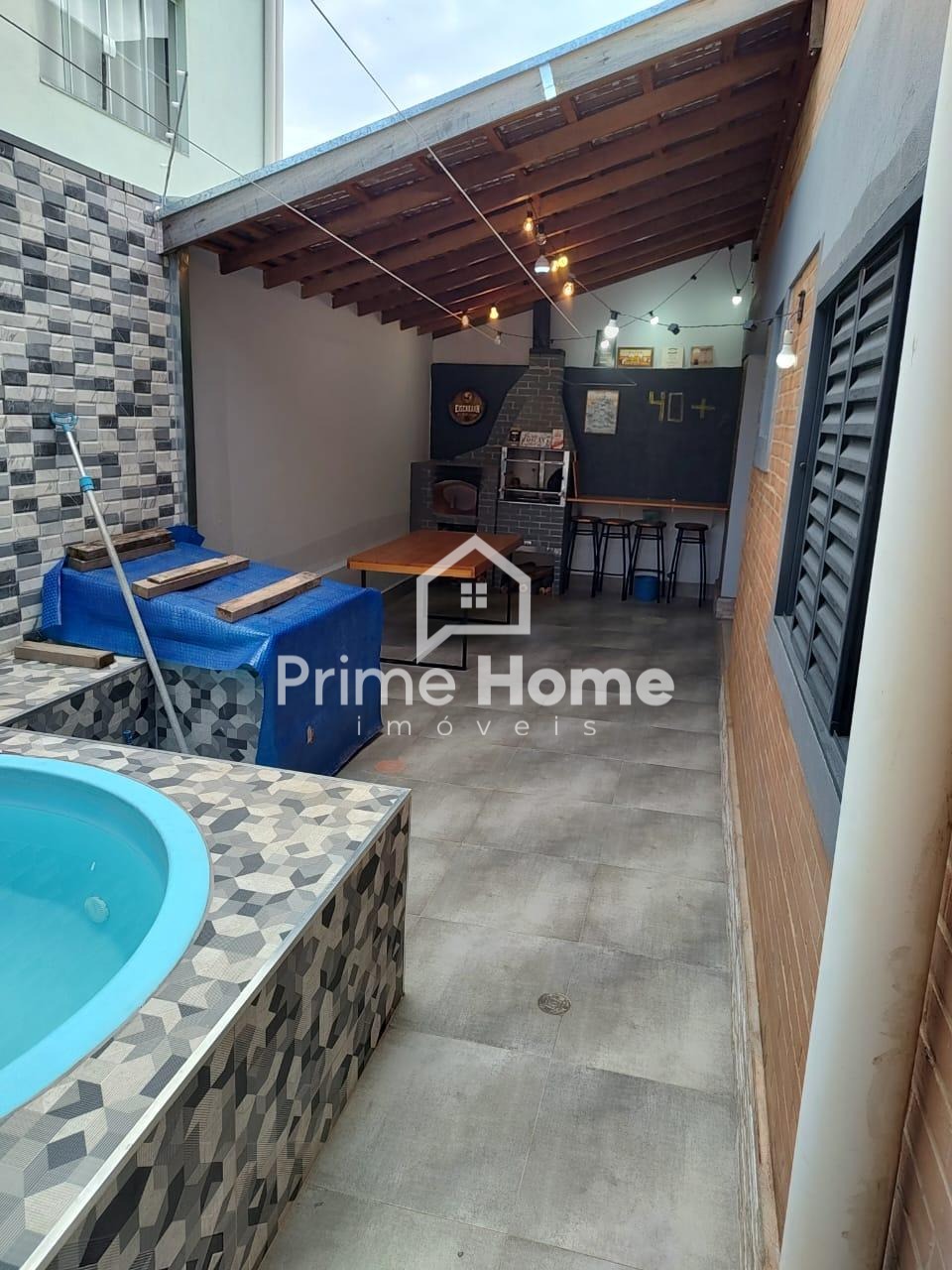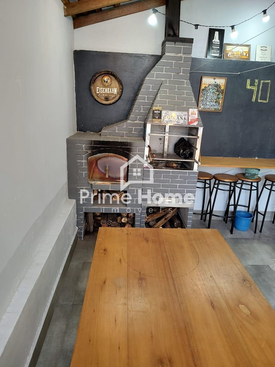 Área gourmet com churrasqueira e forno para pizza com bancada, piscina.
