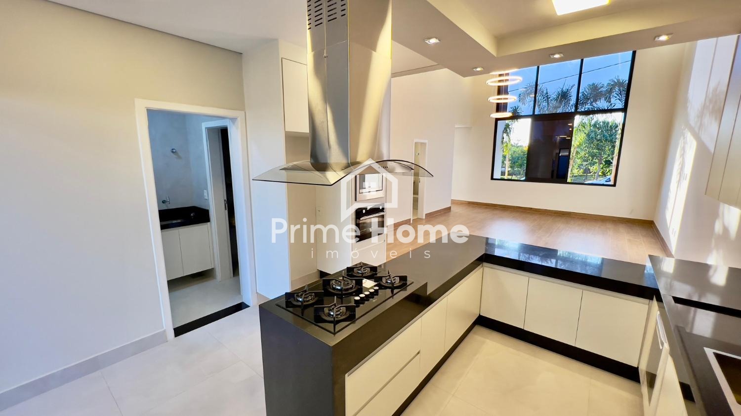 A cozinha é moderna e prática, equipada com micro-ondas, forno, cooktop, máquina de lavar louça e armários planejados. Toda a residência conta com iluminação em LED e lustres decorativos, reforçando a sofisticação dos ambientes.
