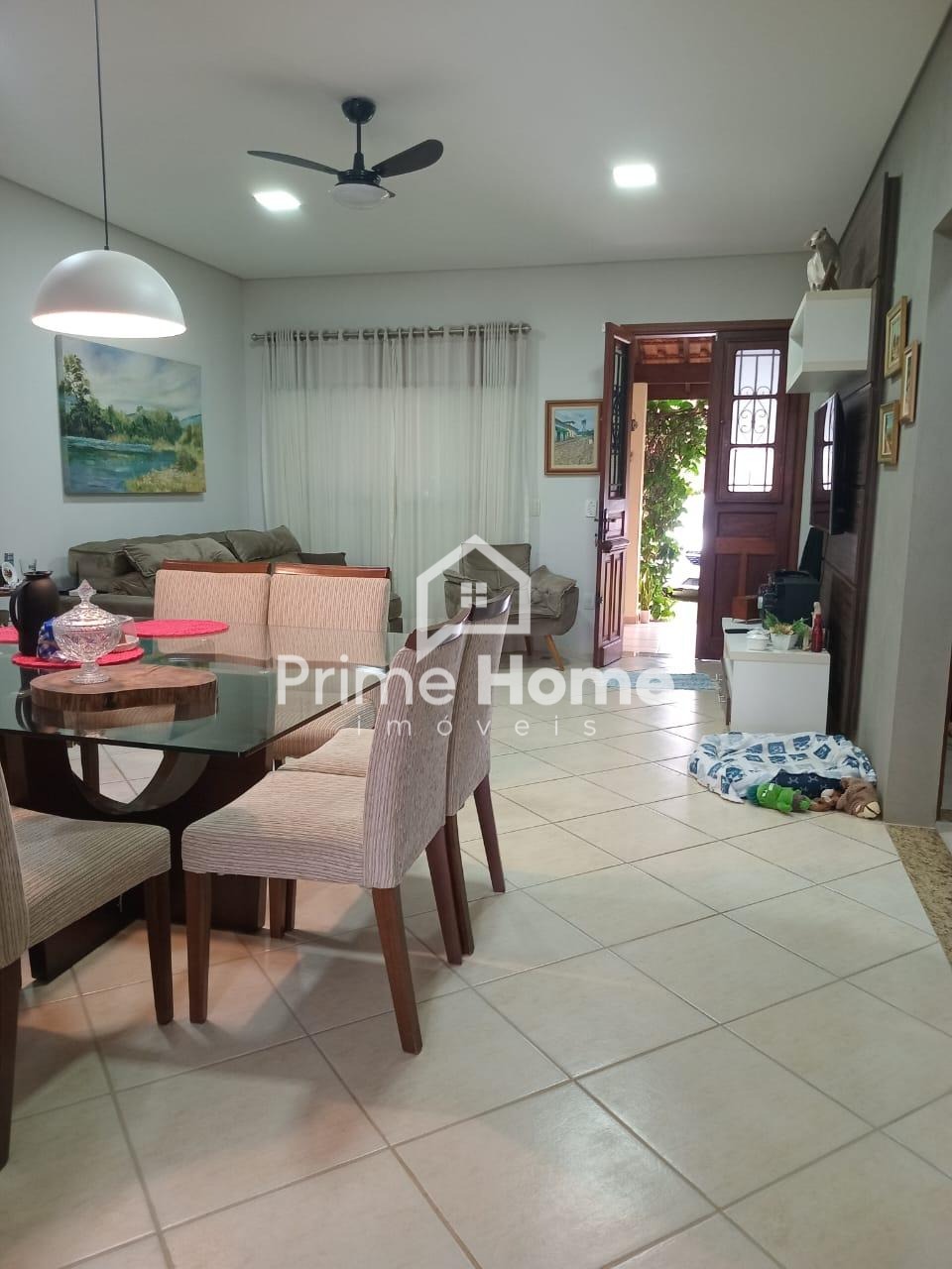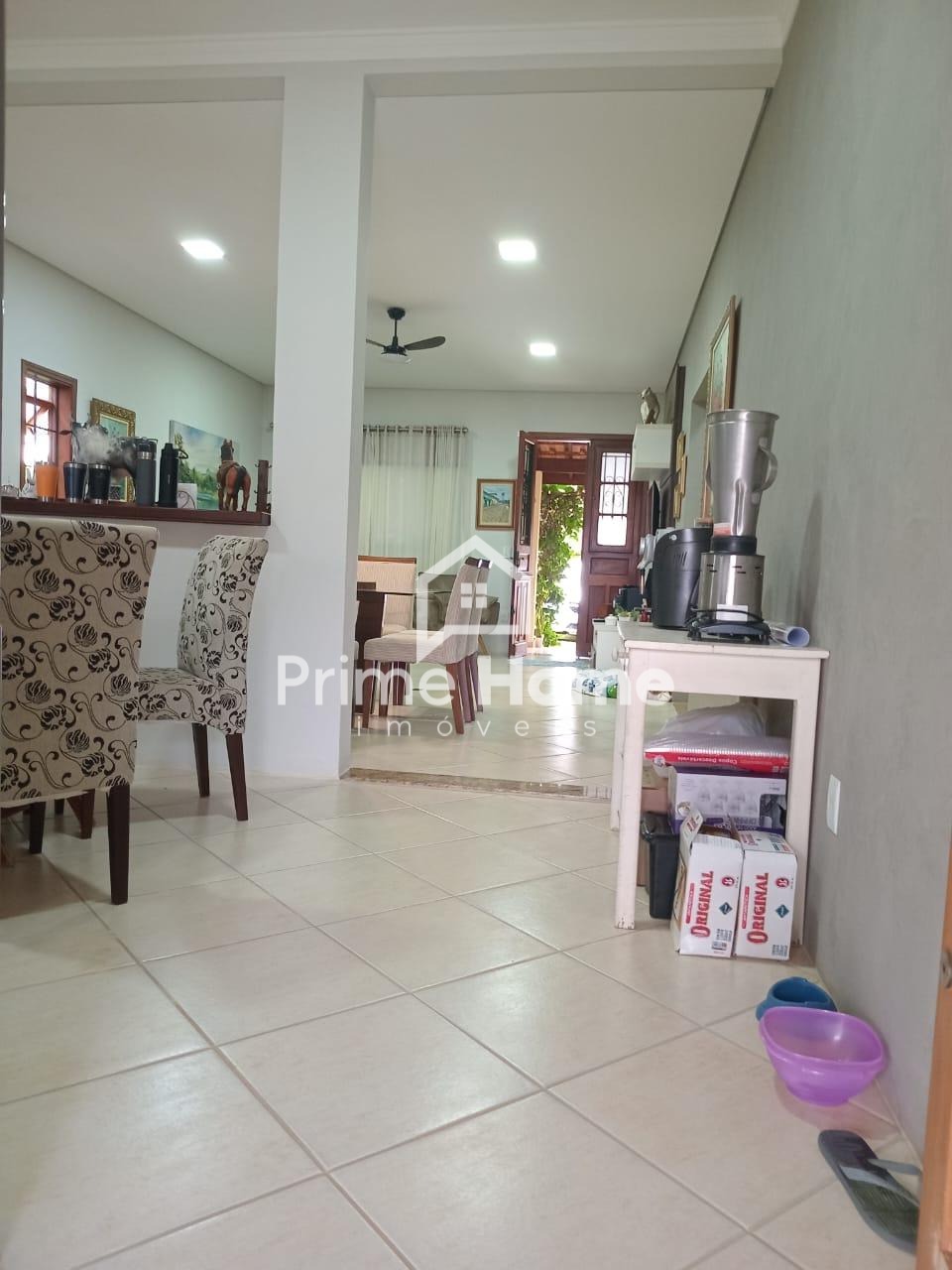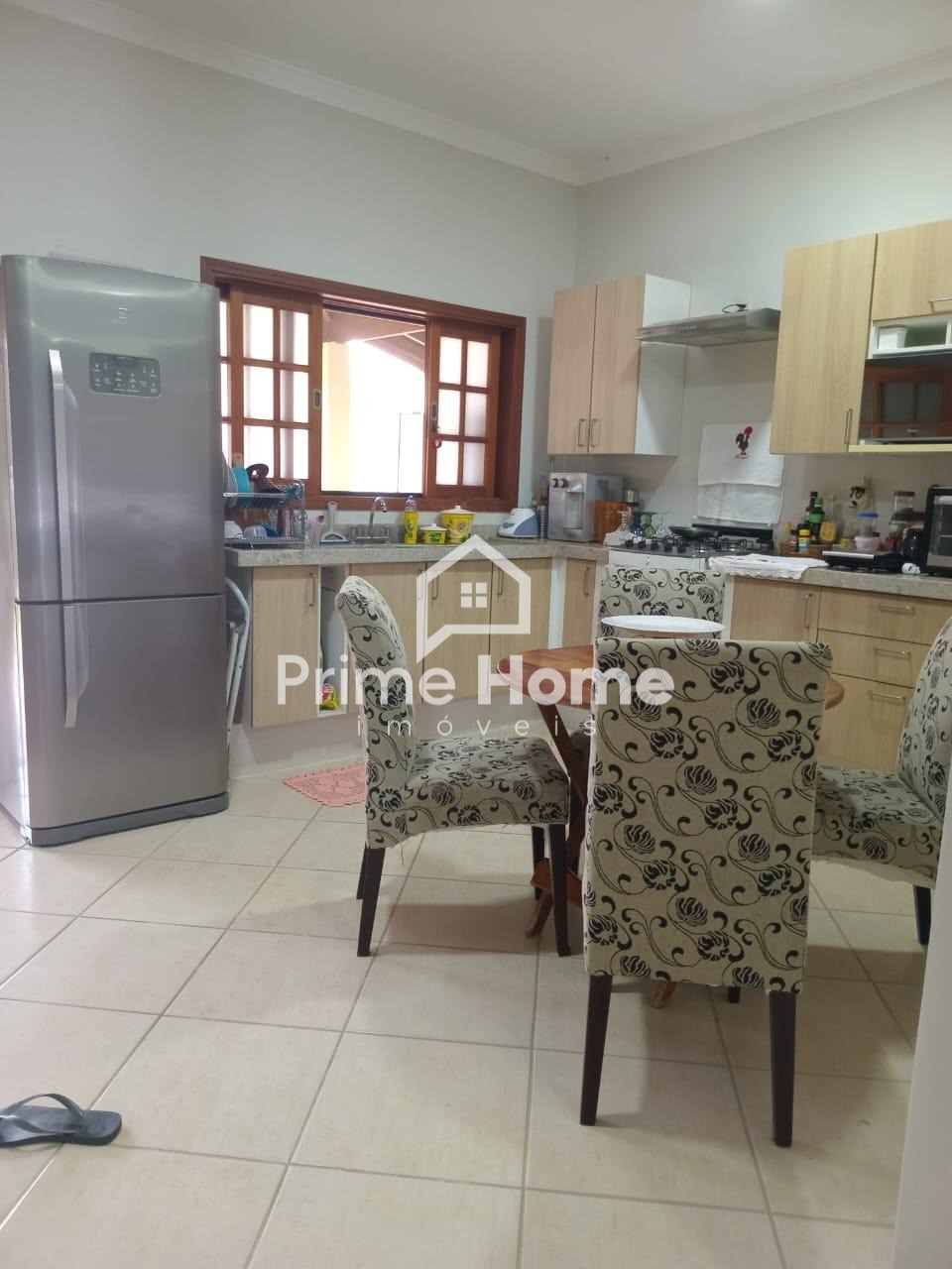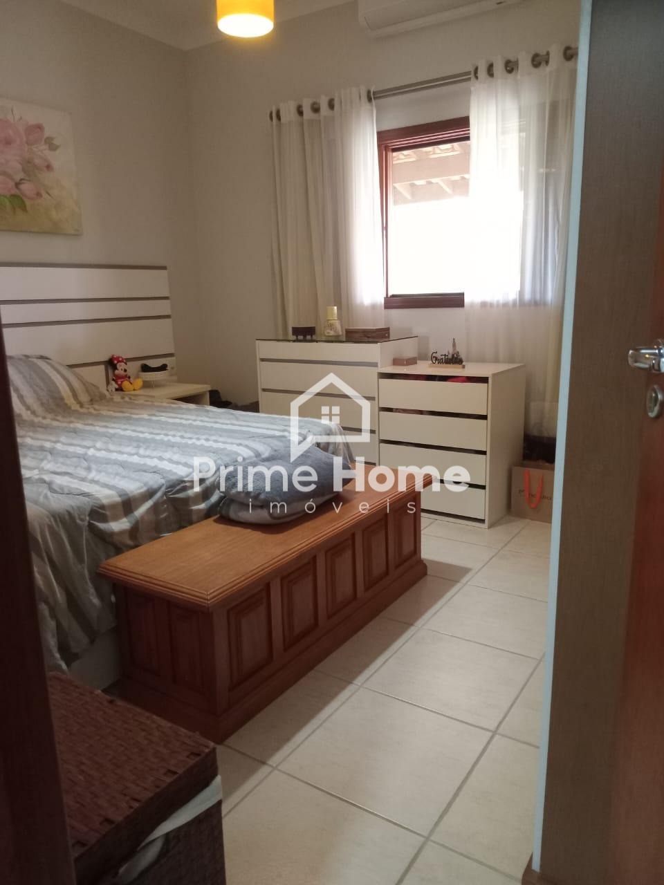 A casa oferece sala ampla com dois ambientes e ar-condicionado, cozinha americana com armários planejados, dois dormitórios com armários embutidos — sendo um deles suíte —, além de banheiro social com box e armário, e lavanderia funcional.