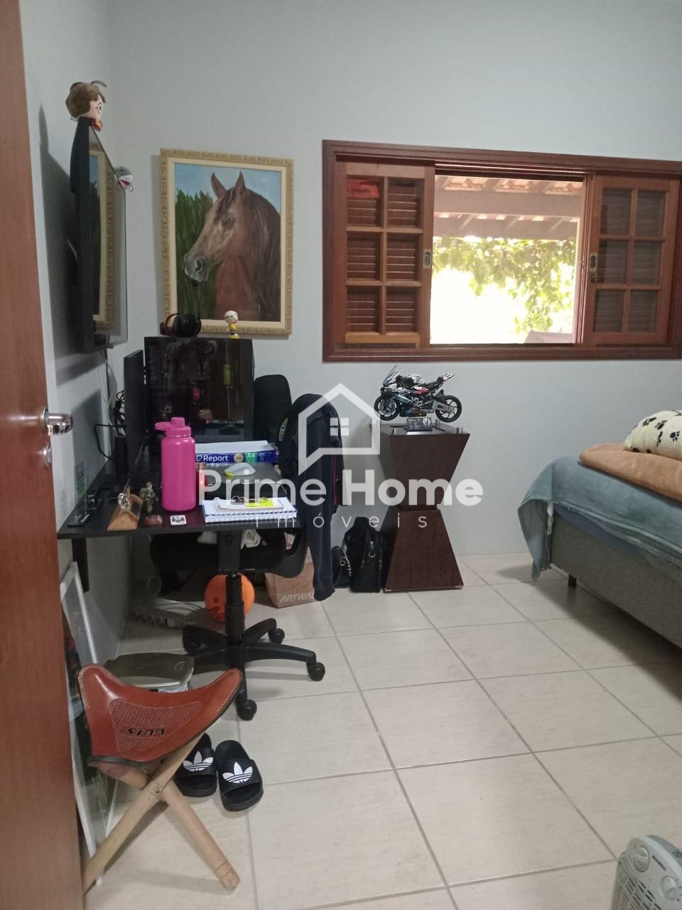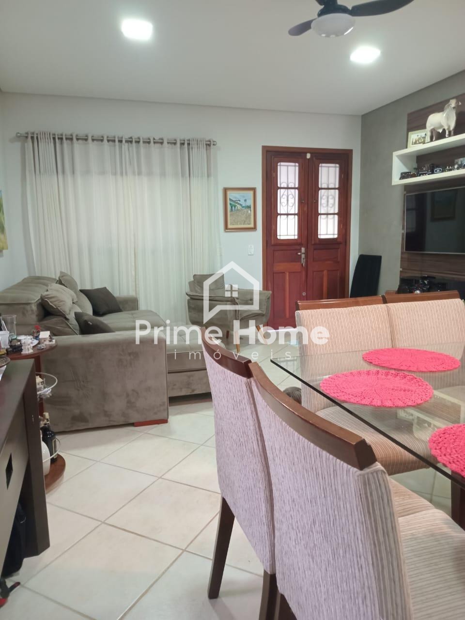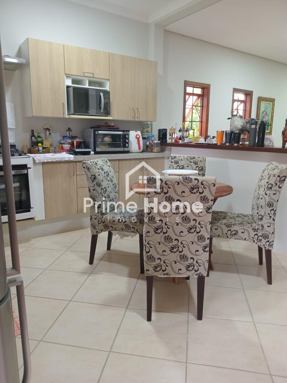 A casa oferece sala ampla com dois ambientes e ar-condicionado, cozinha americana com armários planejados, dois dormitórios com armários embutidos — sendo um deles suíte —, além de banheiro social com box e armário, e lavanderia funcional.