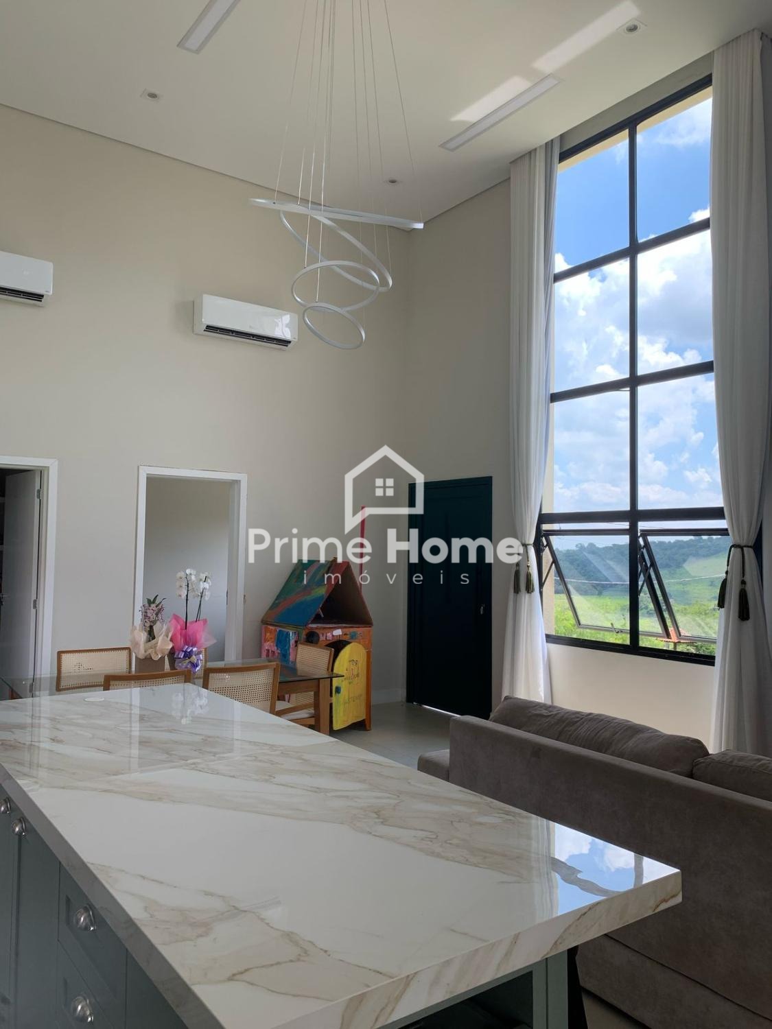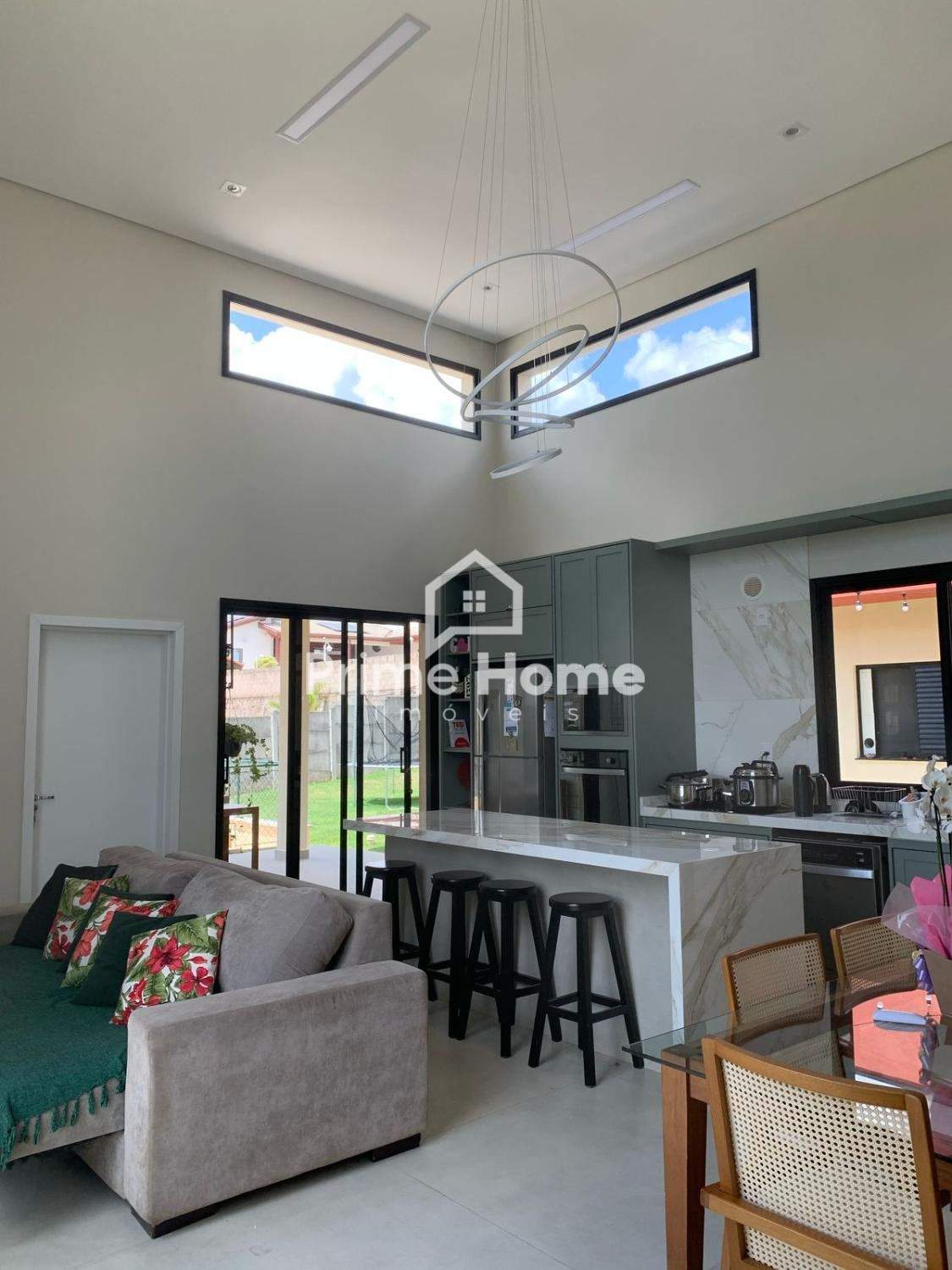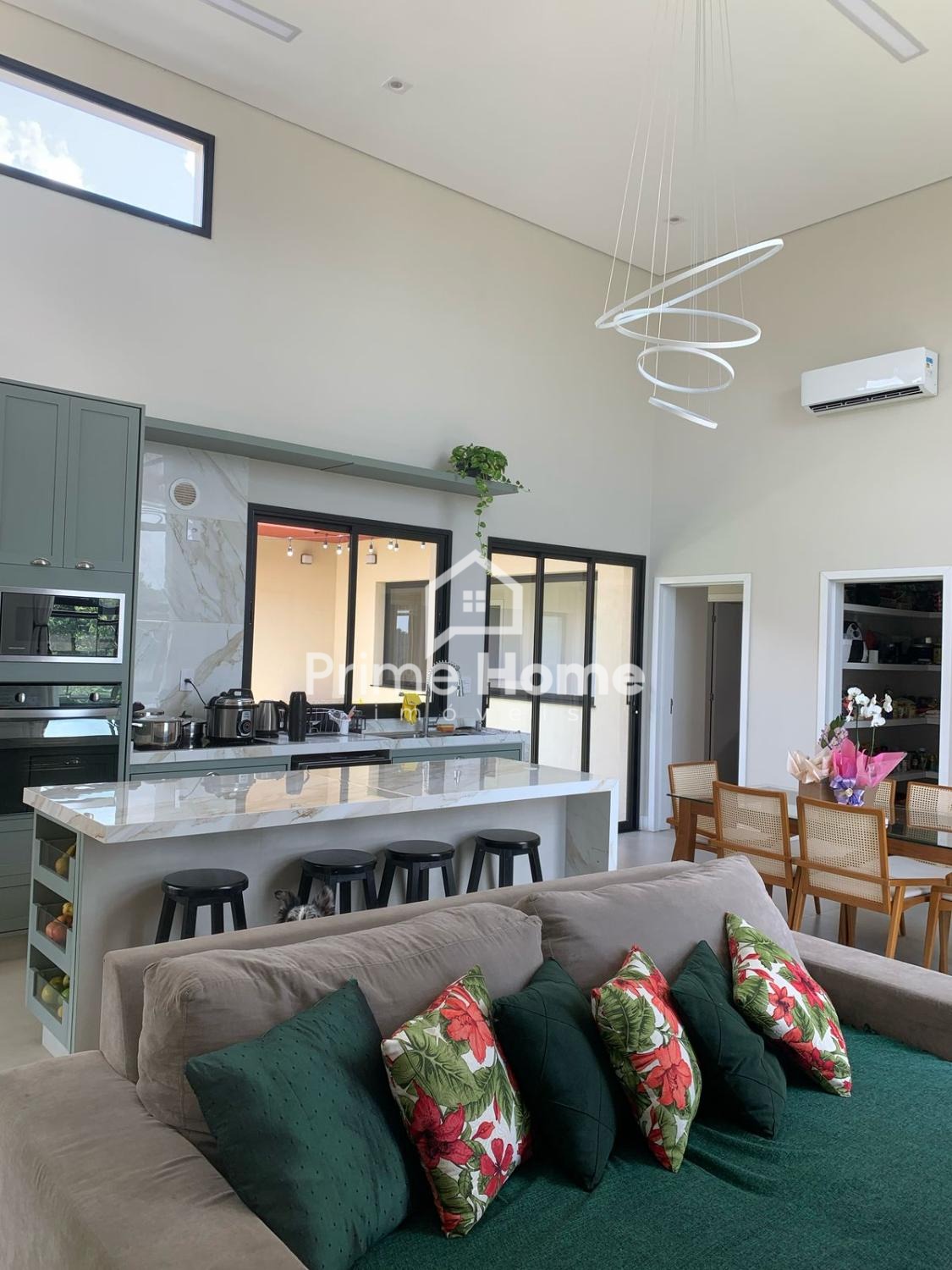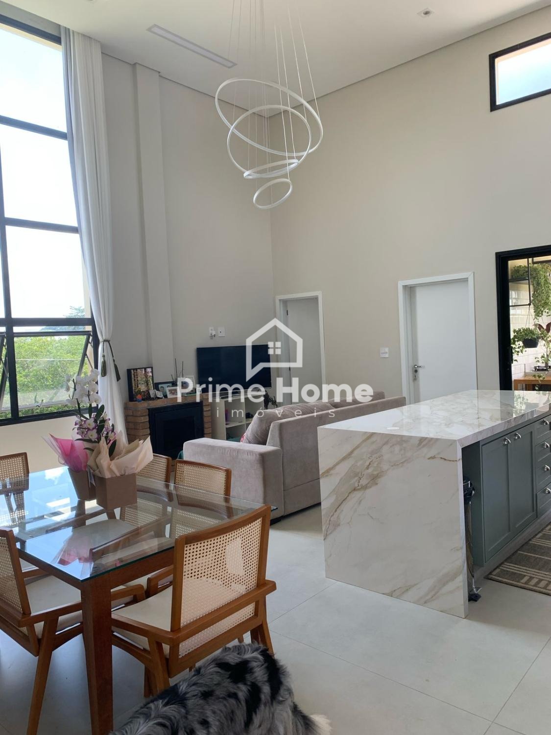 O living de 66m² em pé-direito duplo integra lareira de tripla combustão e bancada gourmet de 2 metros. São 6 ambientes reversíveis (atualmente configurados como 4 dormitórios – 2 suítes – e 2 escritórios), além de 5 banheiros completos.