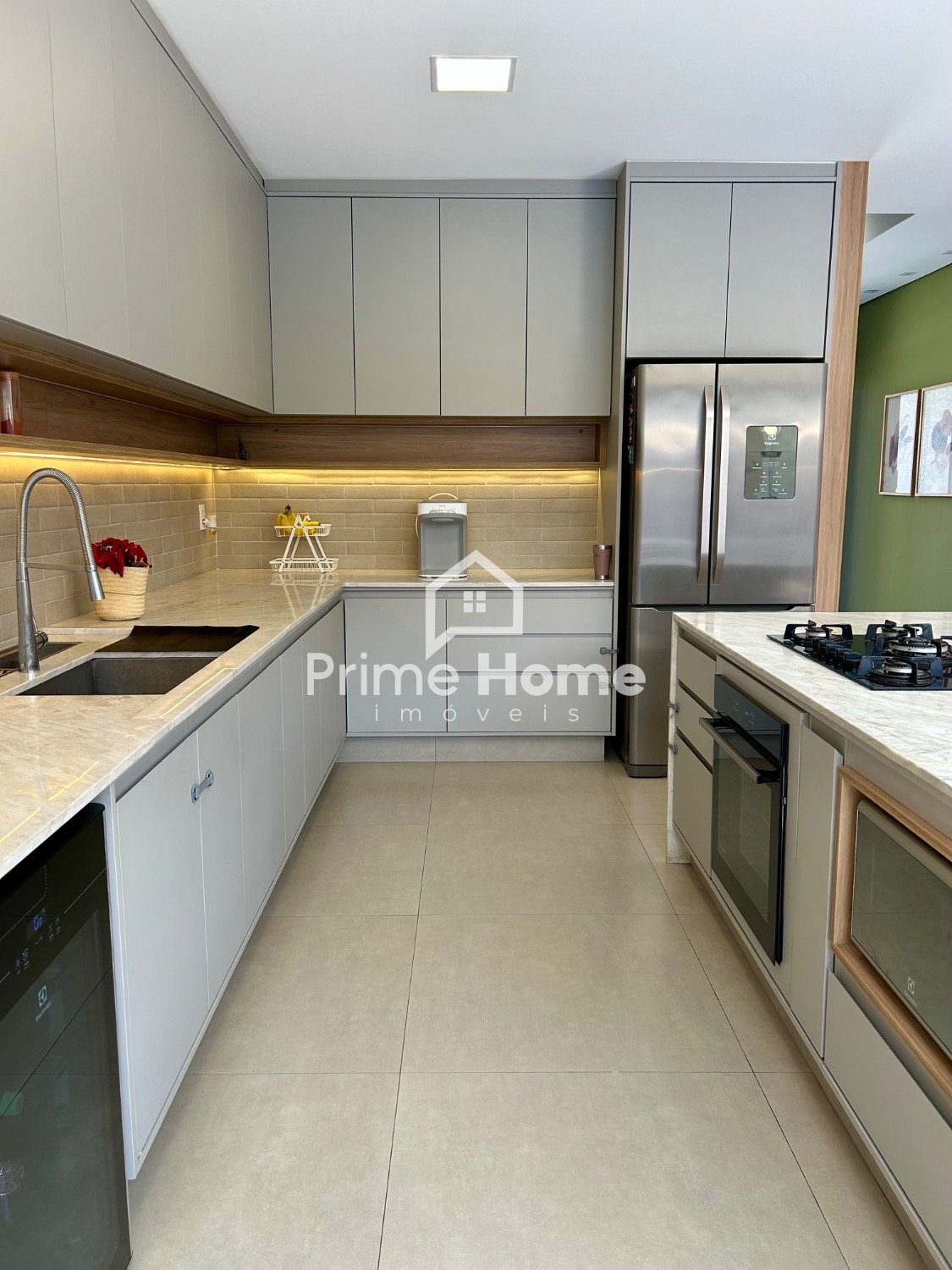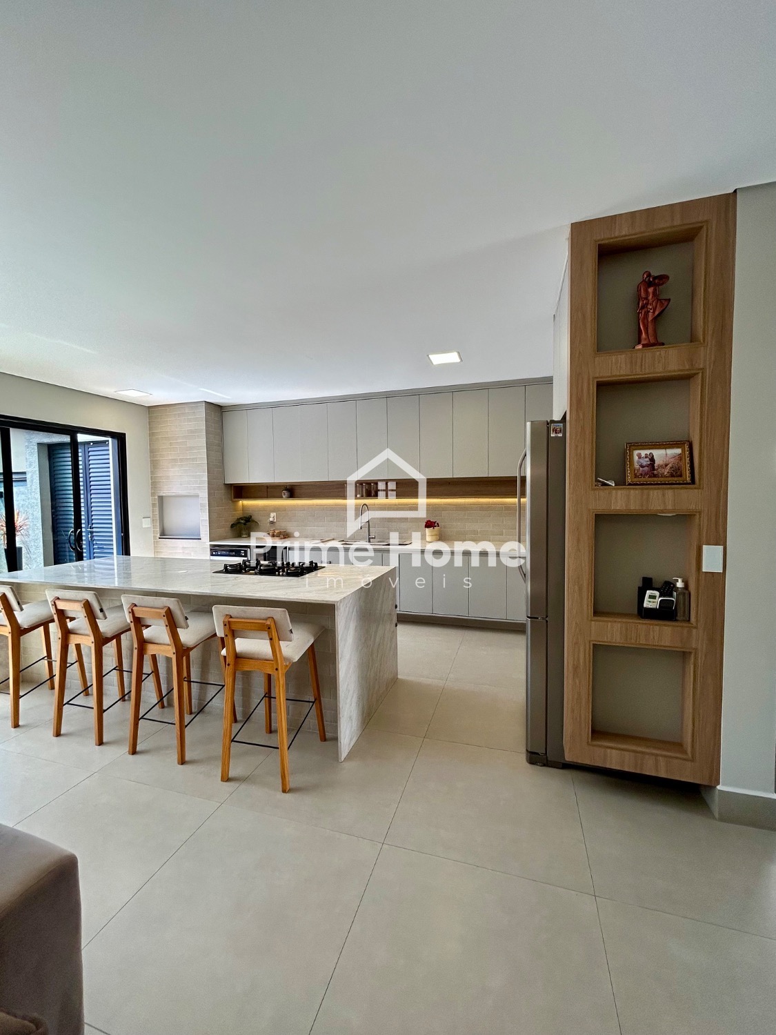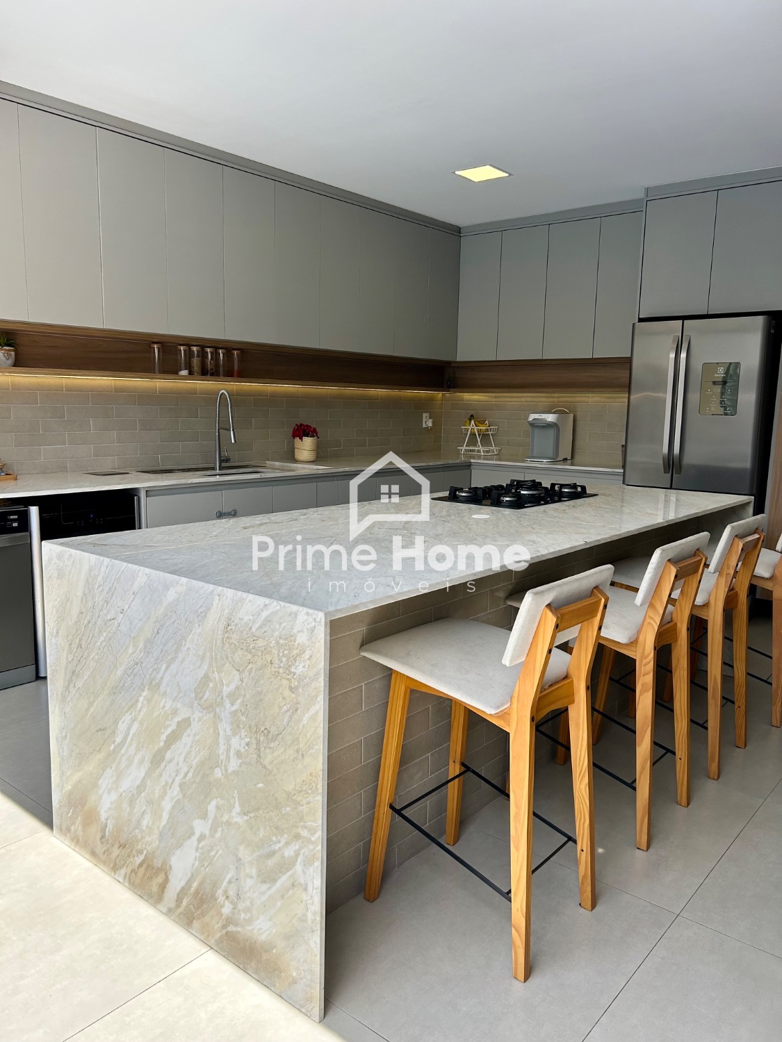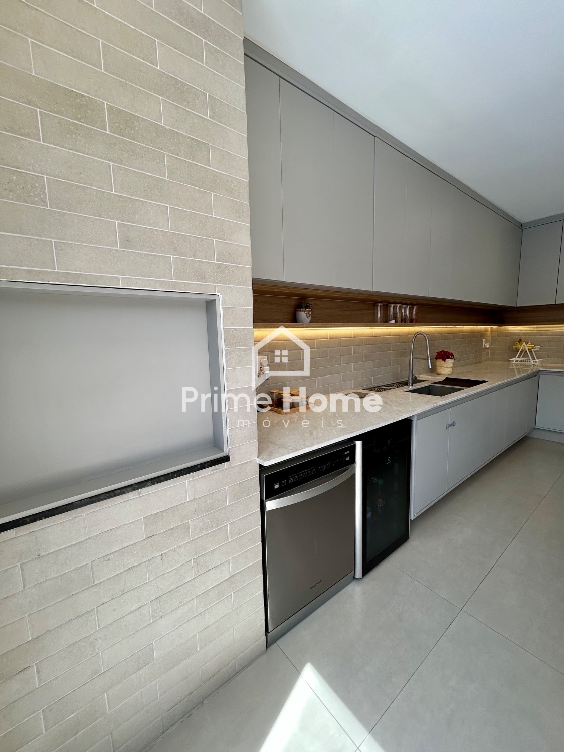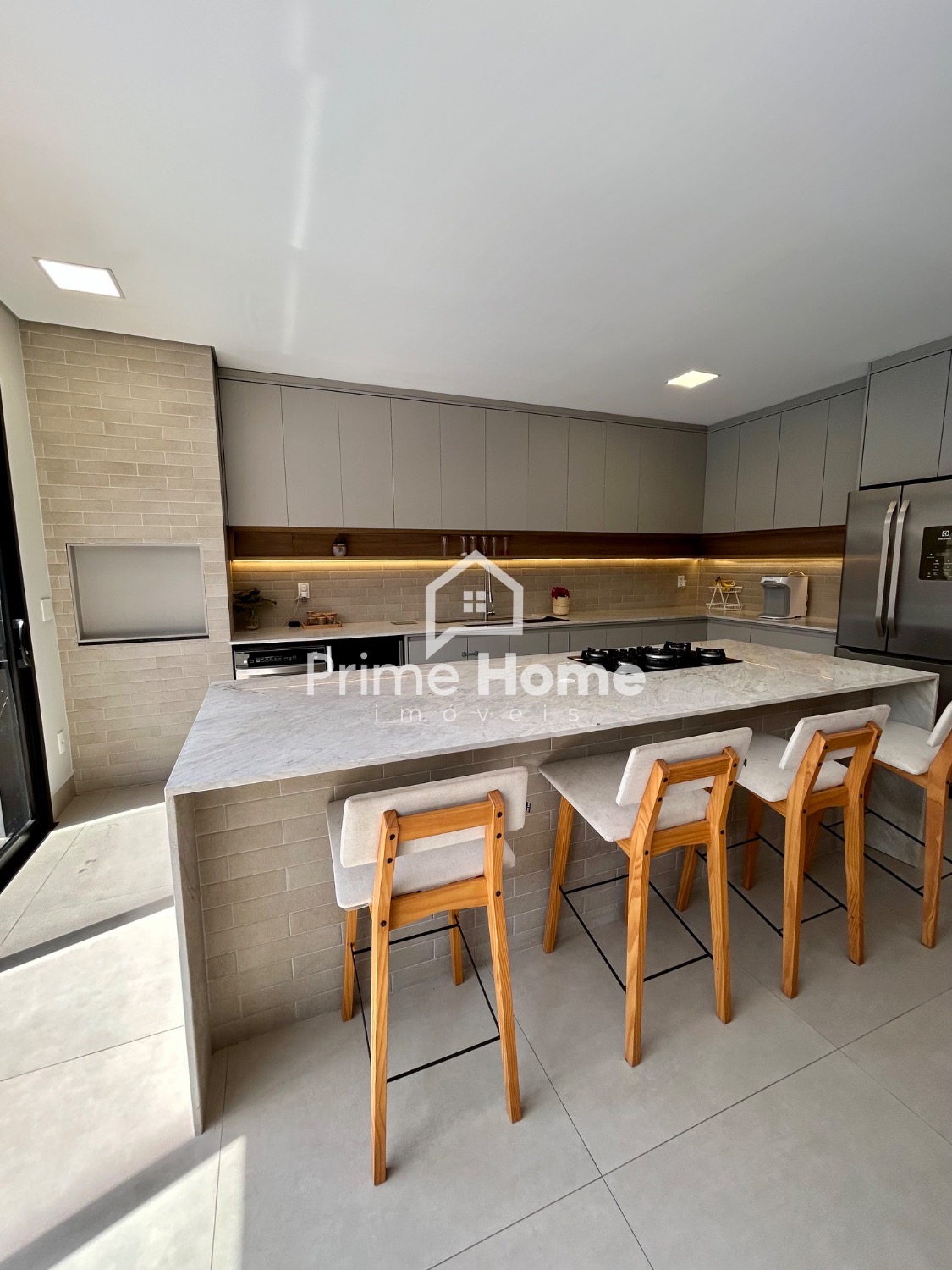 A cozinha gourmet é um dos grandes destaques do imóvel, equipada com ilha em pedra Branco Paraná, cooktop de cinco bocas, forno elétrico, micro-ondas e geladeira Side-by-Side Electrolux, além de cervejeira, lava-louças Brastemp, purificador de água Midea, bancada com cuba tripla inox, escorredor embutido, dispenser, lixeira e torneira gourmet. A churrasqueira segue o mesmo padrão, com armários, nichos decorativos e iluminação em LED.
