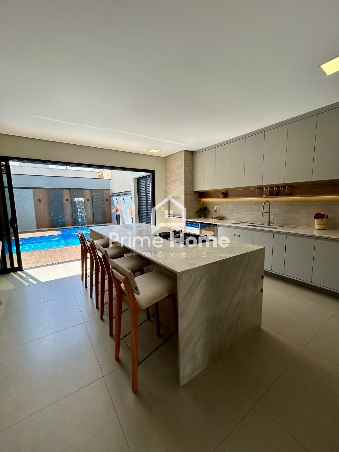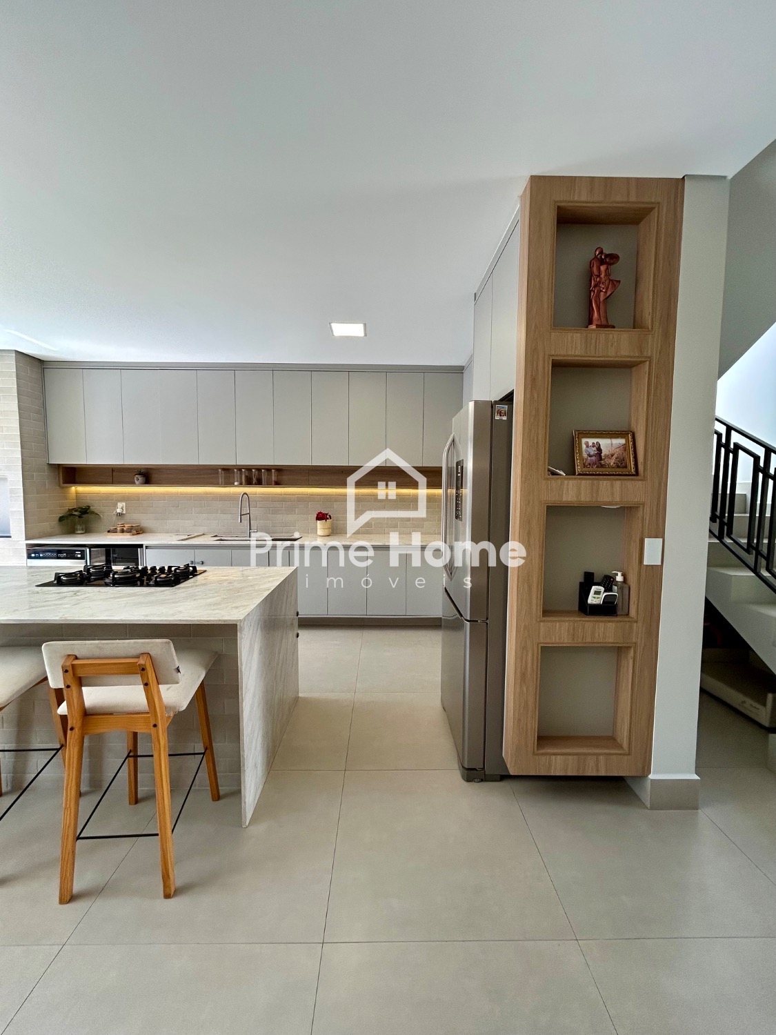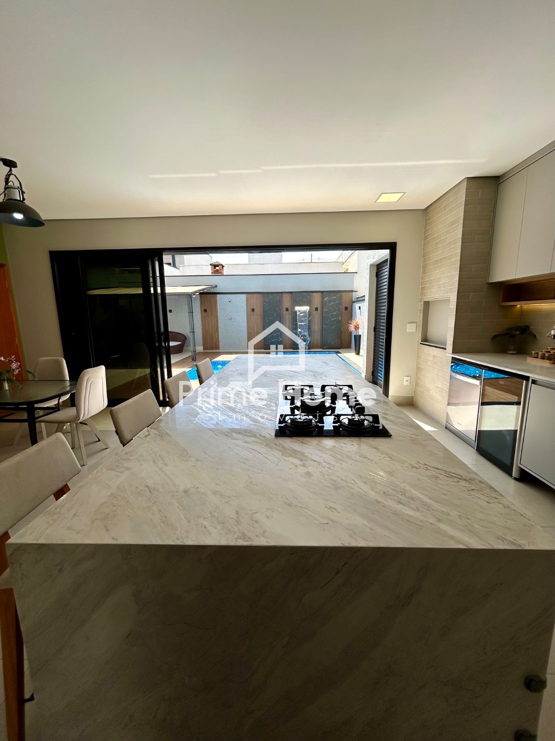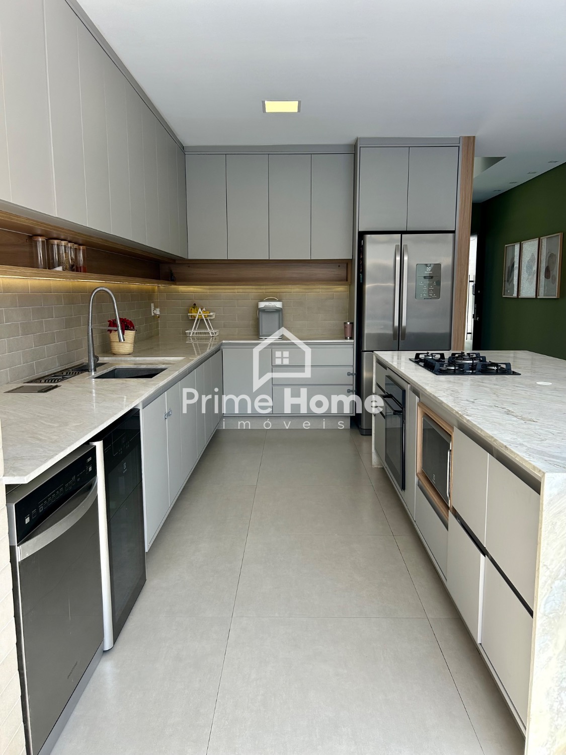 A cozinha gourmet é um dos grandes destaques do imóvel, equipada com ilha em pedra Branco Paraná, cooktop de cinco bocas, forno elétrico, micro-ondas e geladeira Side-by-Side Electrolux, além de cervejeira, lava-louças Brastemp, purificador de água Midea, bancada com cuba tripla inox, escorredor embutido, dispenser, lixeira e torneira gourmet. A churrasqueira segue o mesmo padrão, com armários, nichos decorativos e iluminação em LED.