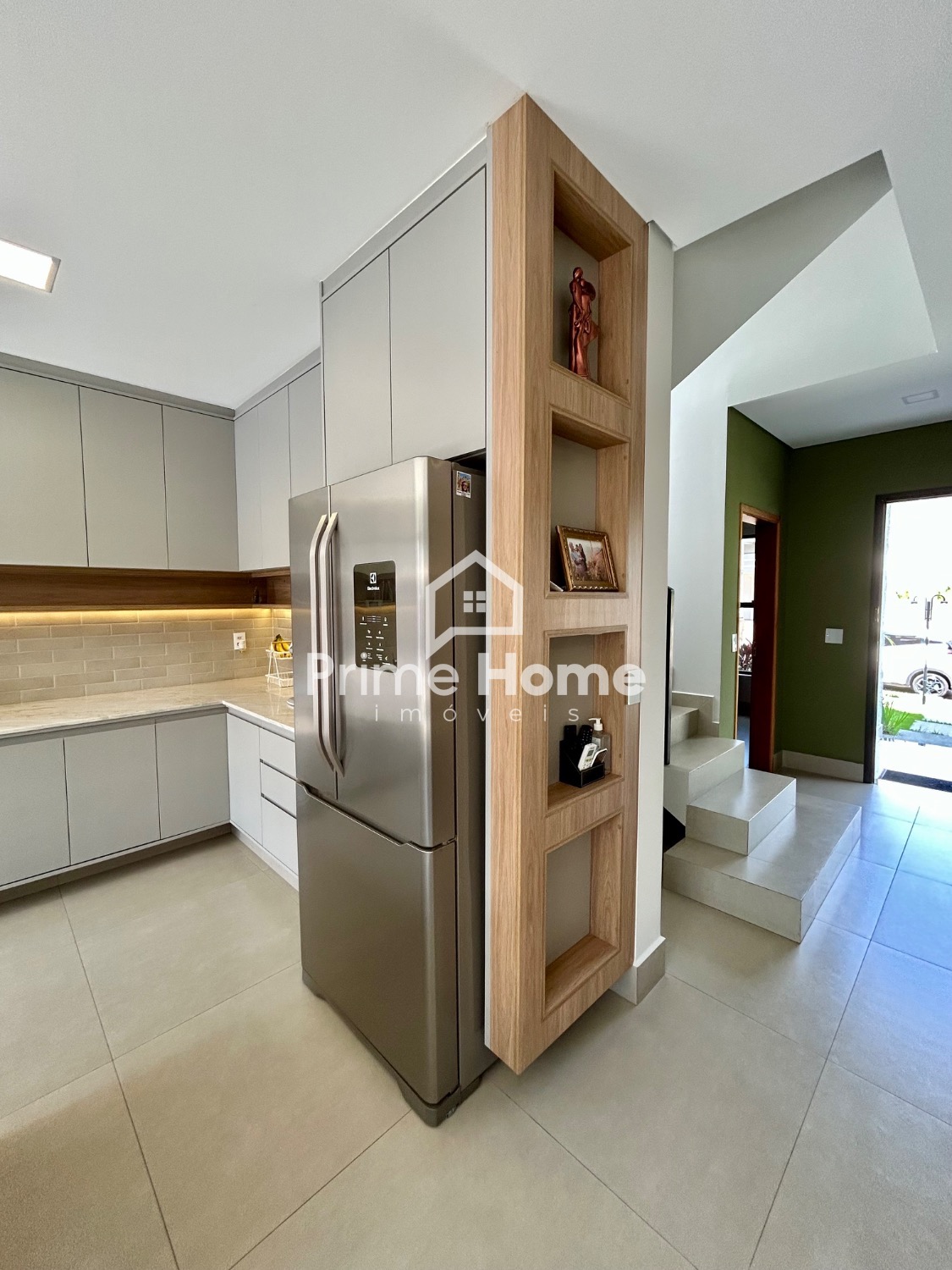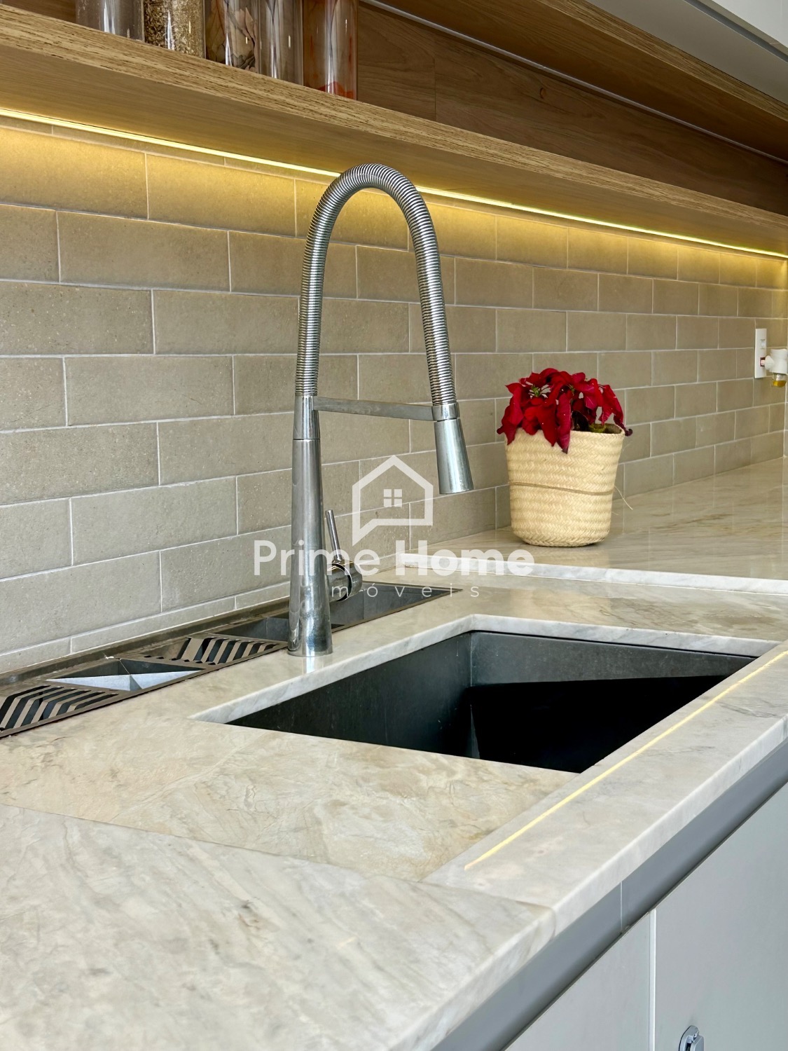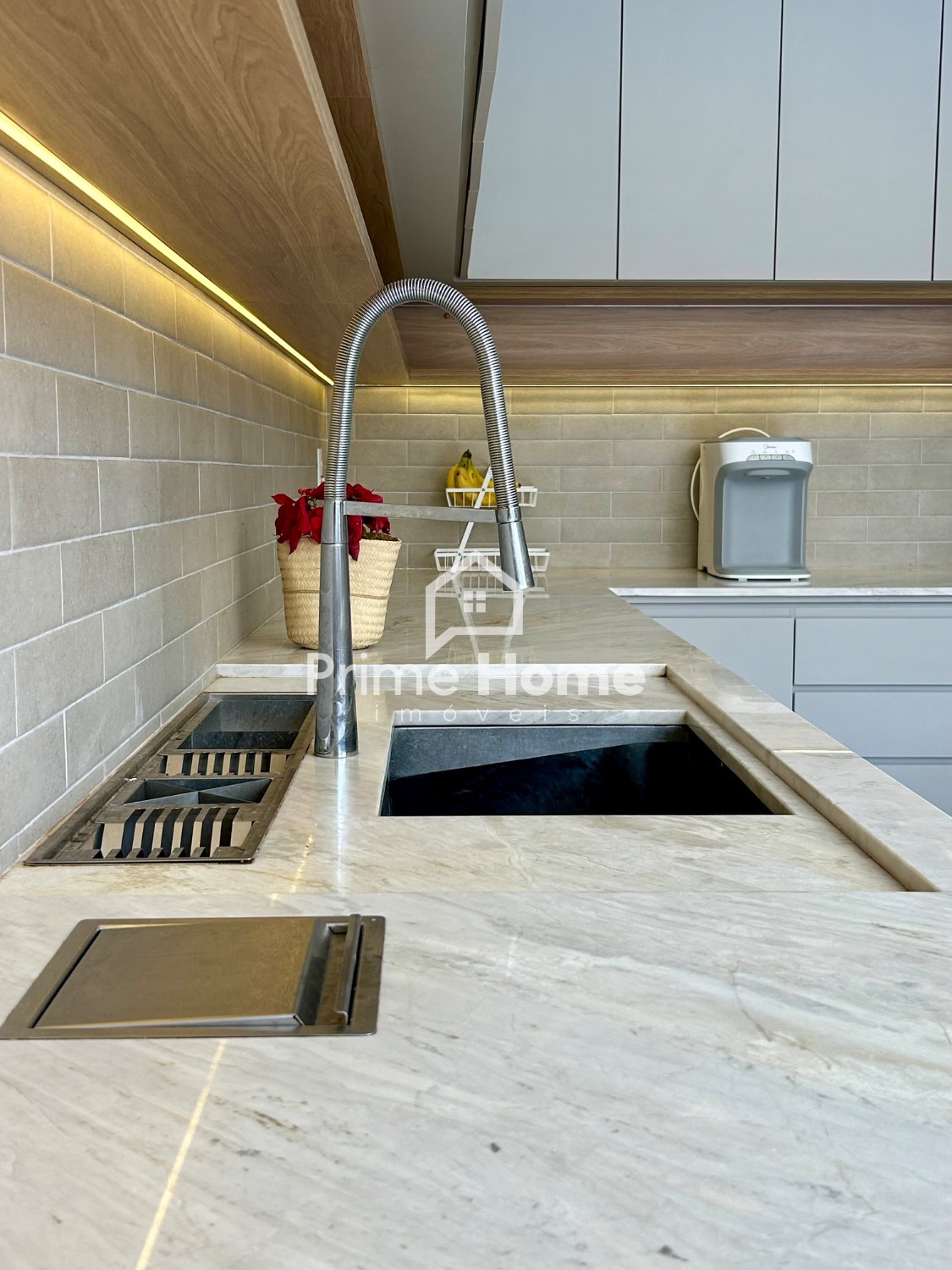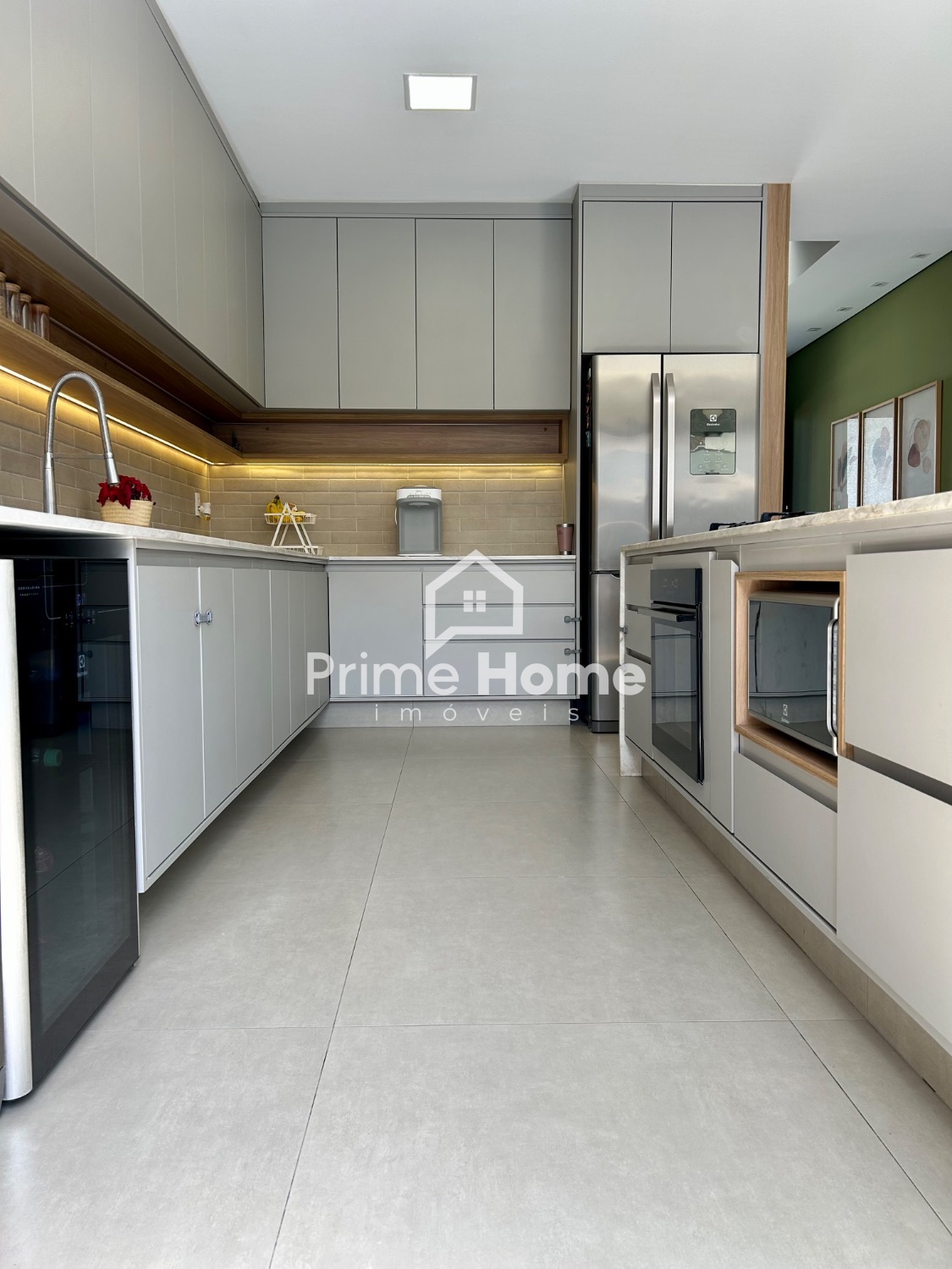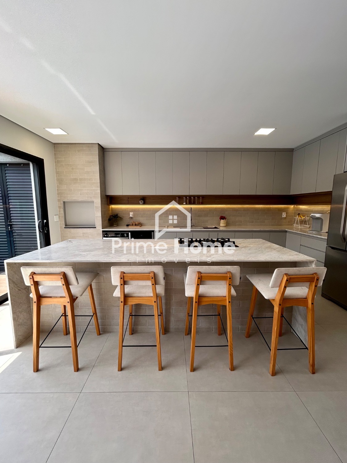 A cozinha gourmet é um dos grandes destaques do imóvel, equipada com ilha em pedra Branco Paraná, cooktop de cinco bocas, forno elétrico, micro-ondas e geladeira Side-by-Side Electrolux, além de cervejeira, lava-louças Brastemp, purificador de água Midea, bancada com cuba tripla inox, escorredor embutido, dispenser, lixeira e torneira gourmet. A churrasqueira segue o mesmo padrão, com armários, nichos decorativos e iluminação em LED.