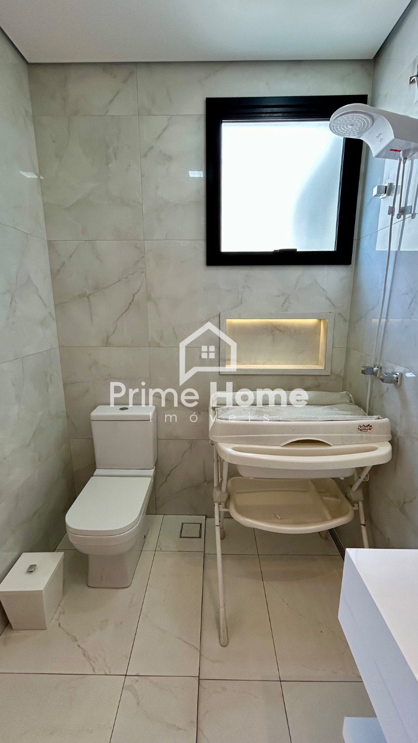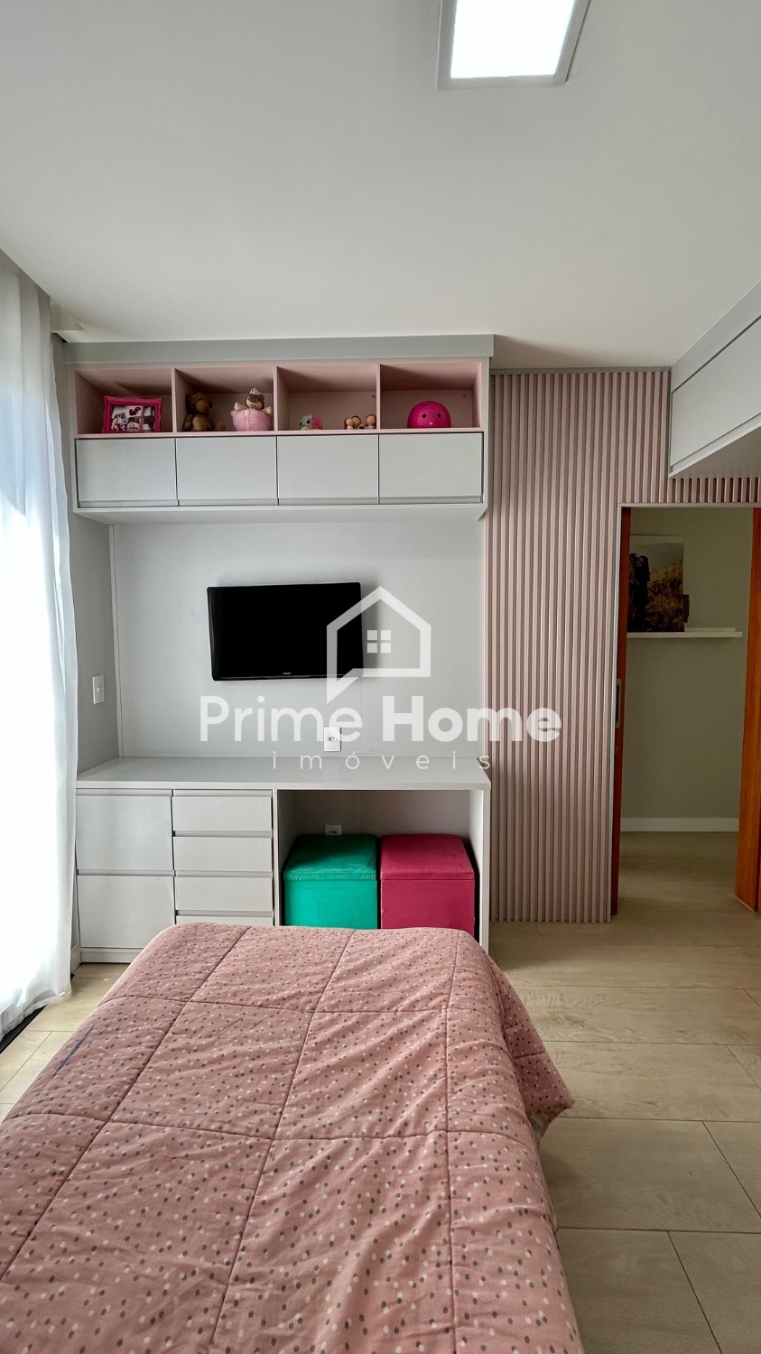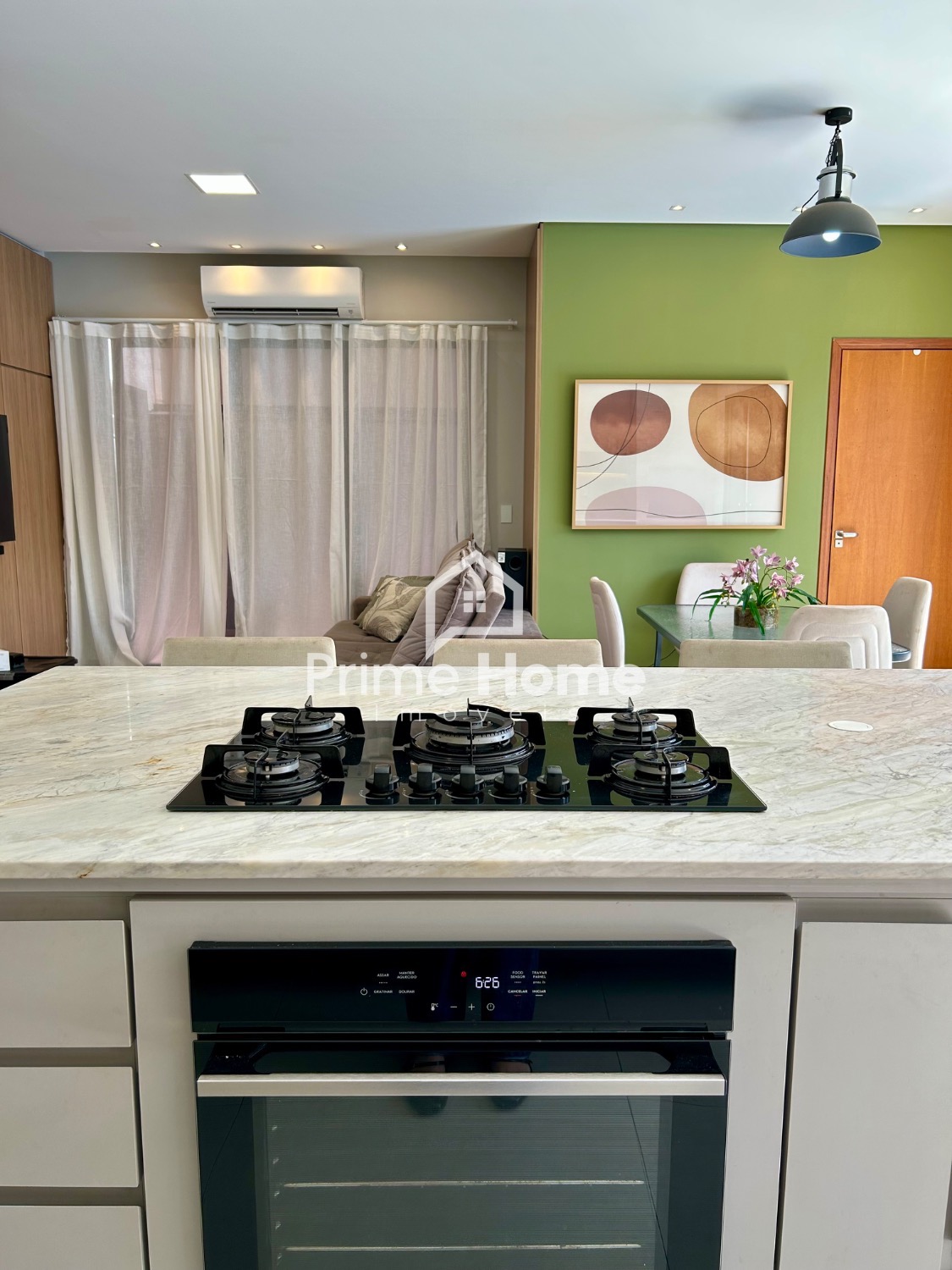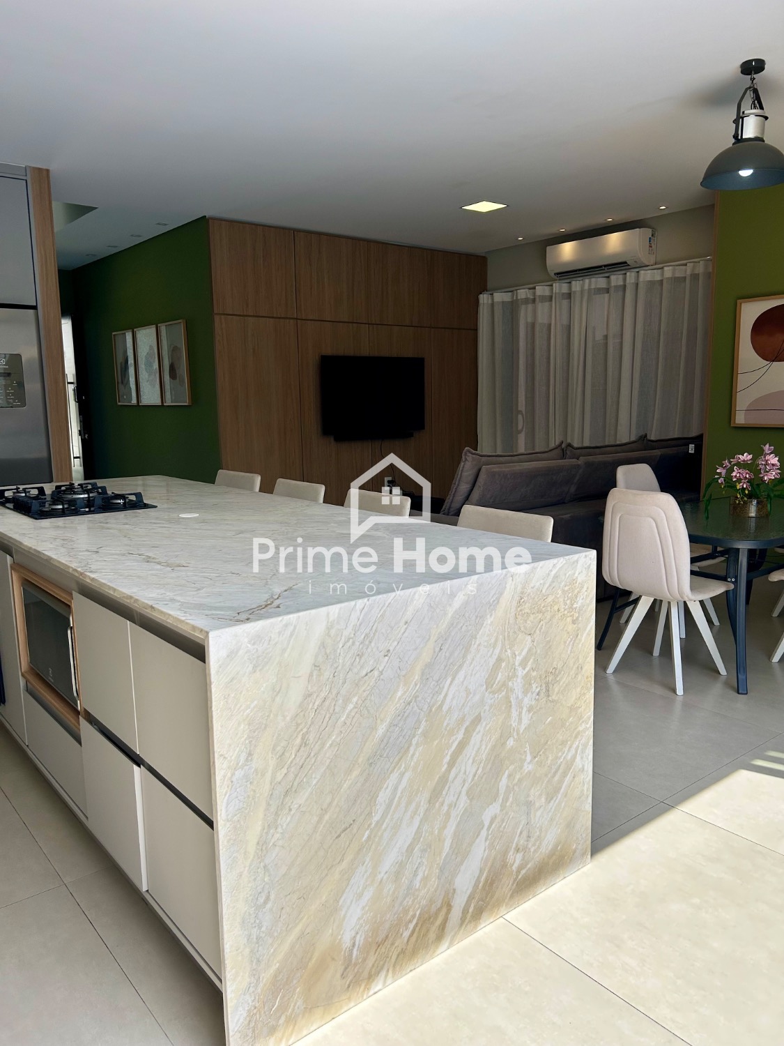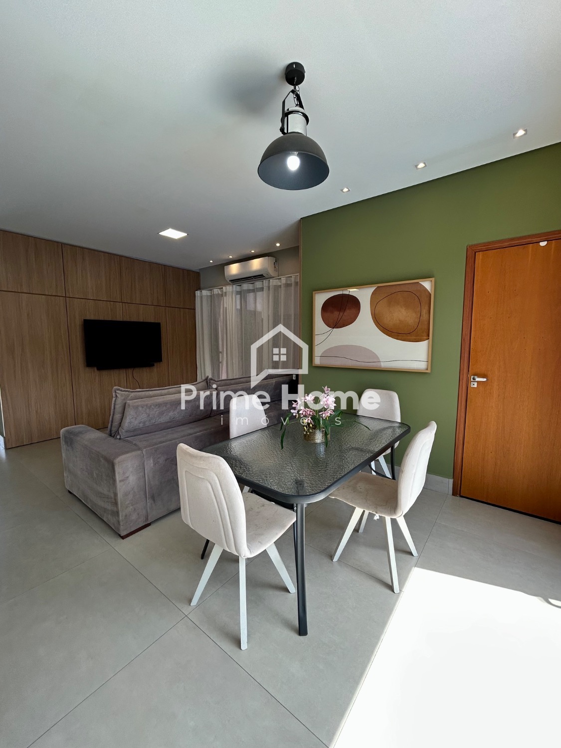 O living integrado proporciona sofisticação e conforto, com sala de TV equipada com ar-condicionado Split Daikin de 24.000 BTUs e painel planejado. A sala de jantar é charmosa, com uma luminária pendente que valoriza o ambiente.