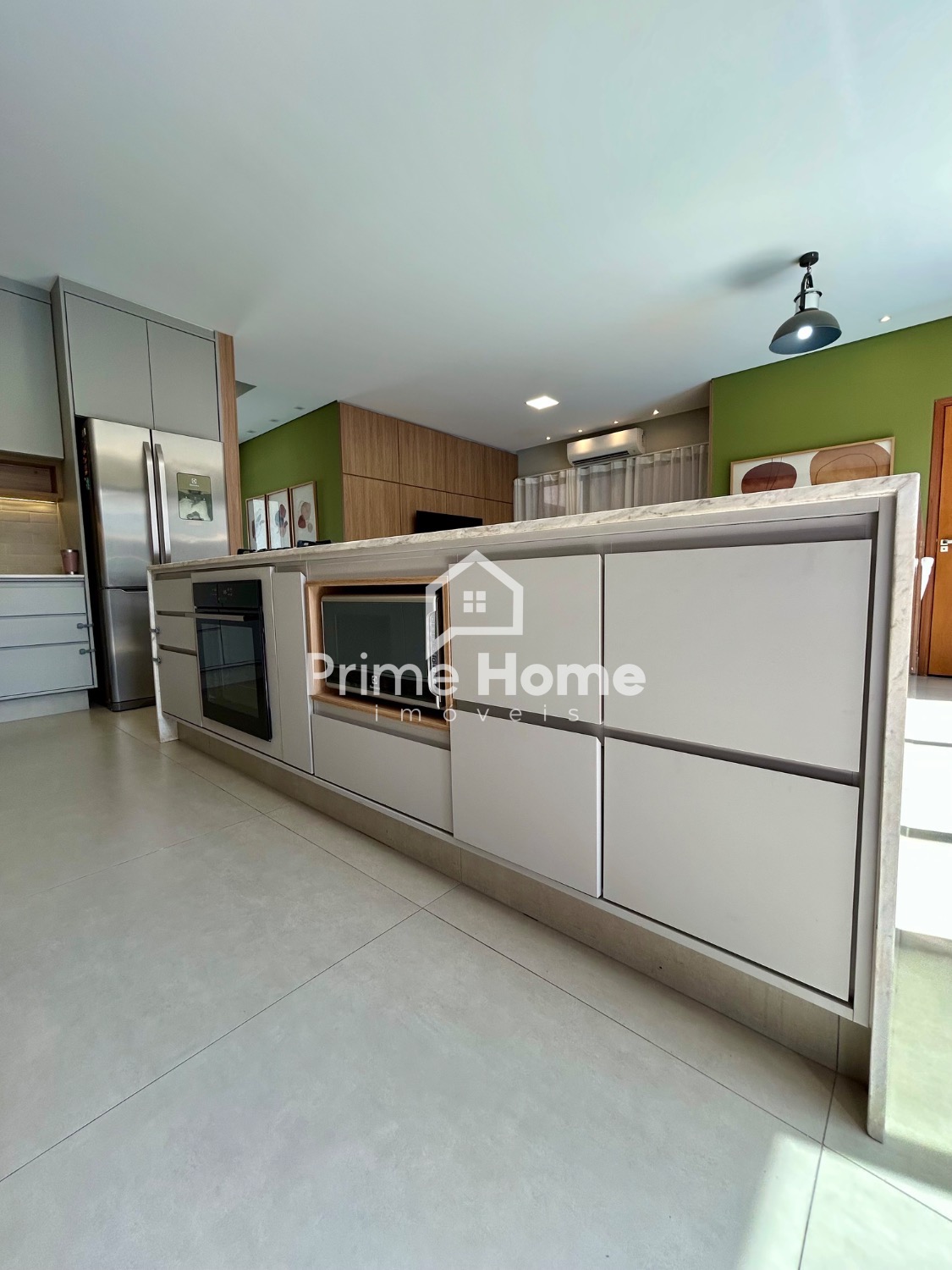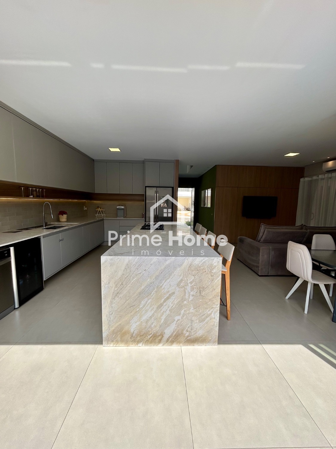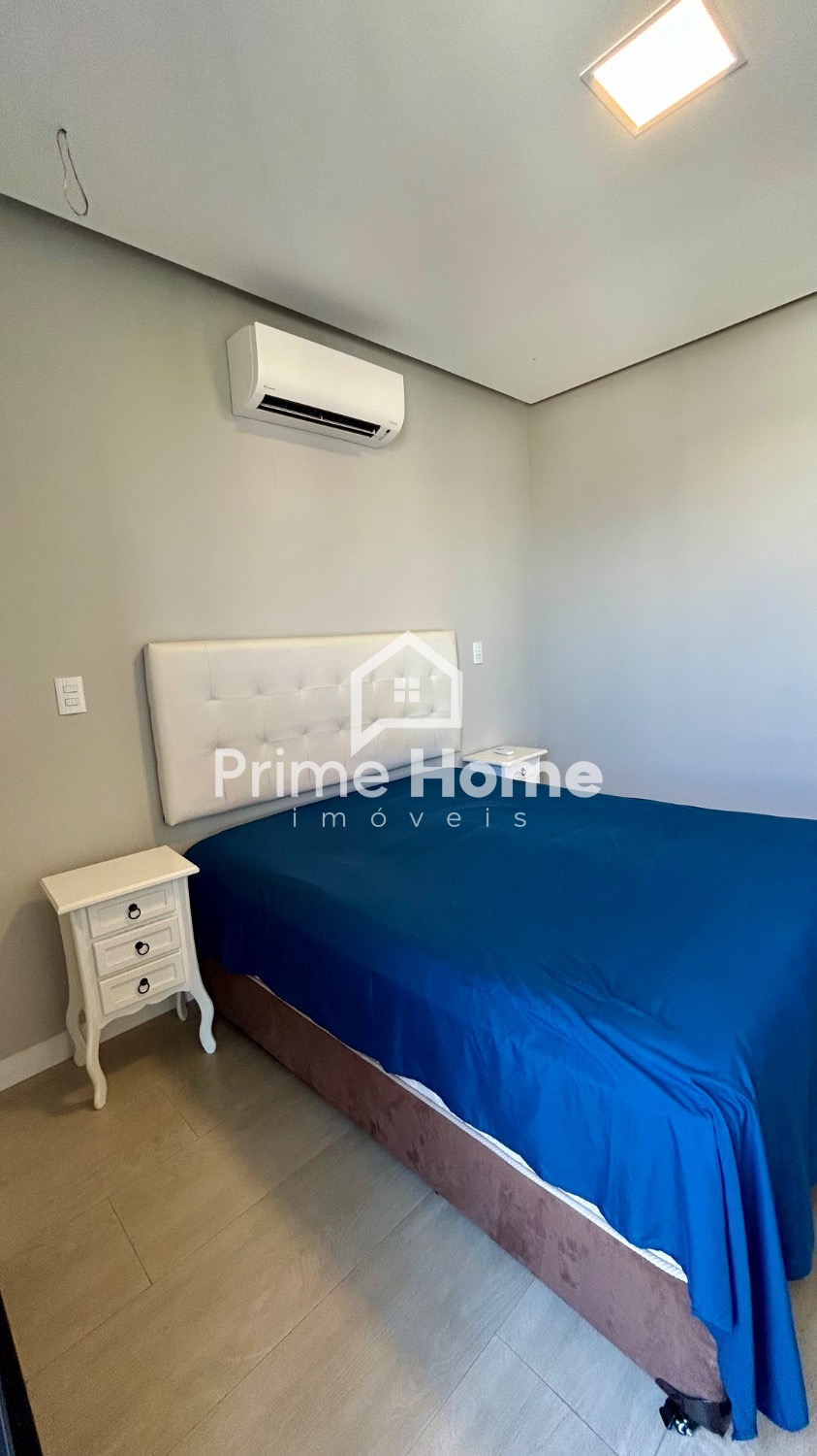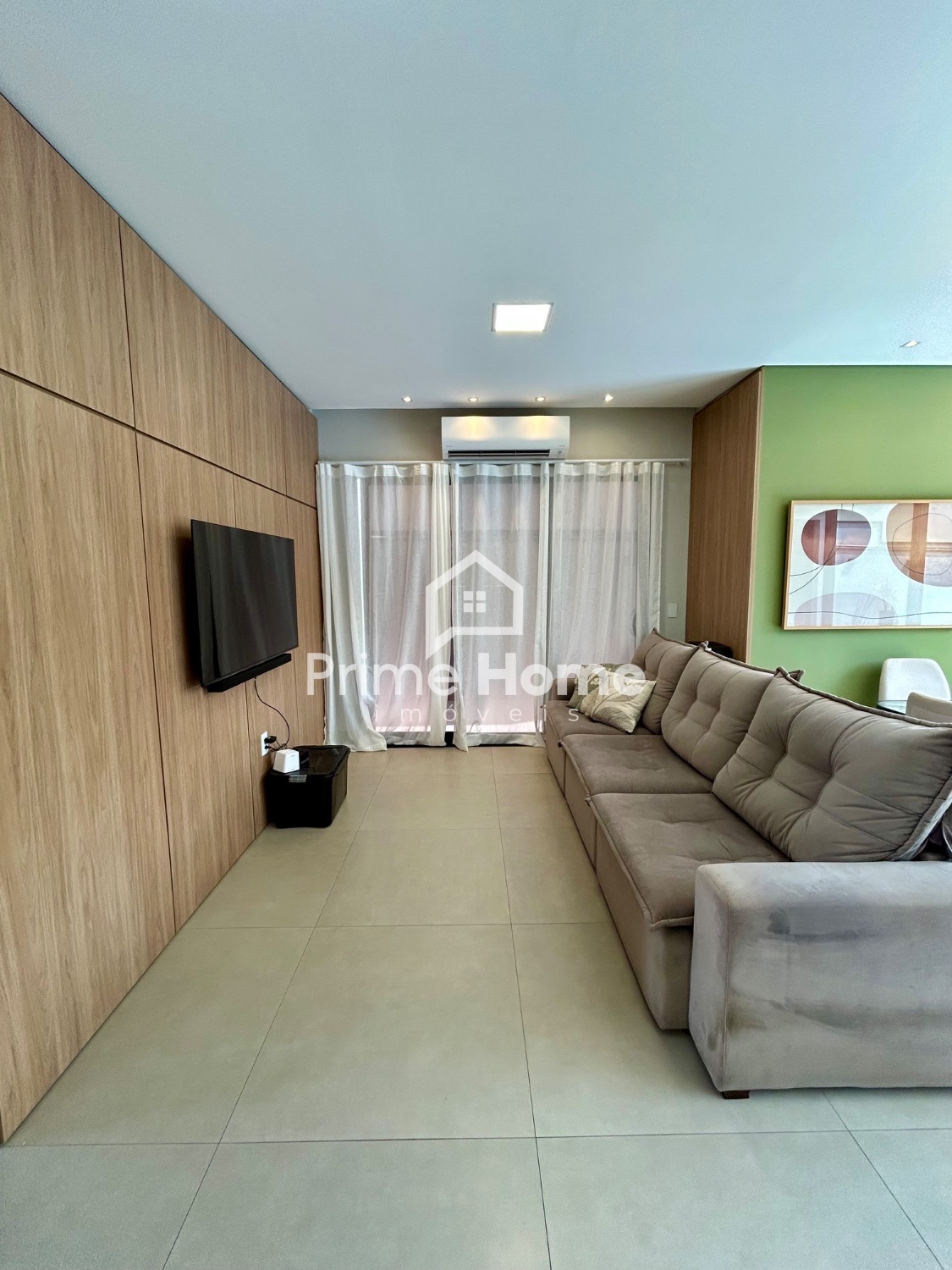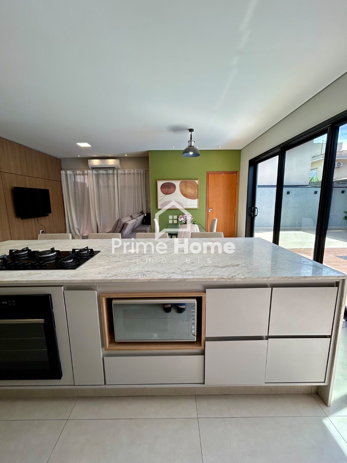 O living integrado proporciona sofisticação e conforto, com sala de TV equipada com ar-condicionado Split Daikin de 24.000 BTUs e painel planejado. A sala de jantar é charmosa, com uma luminária pendente que valoriza o ambiente.
