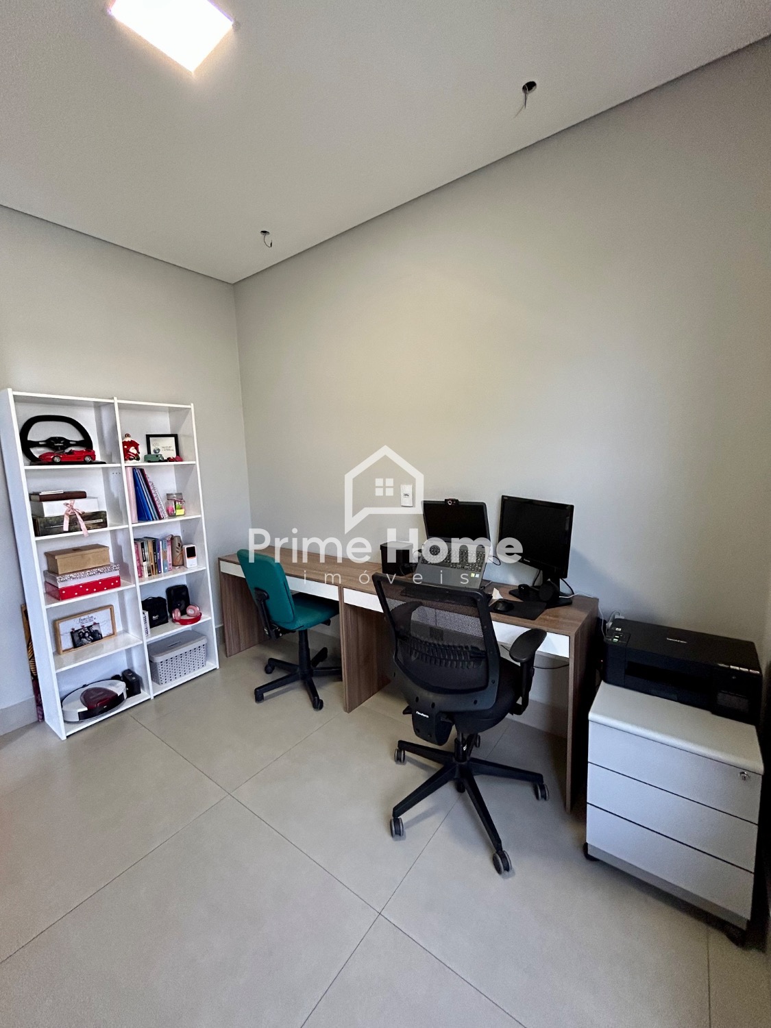 A entrada é marcada por uma imponente porta pivotante com fechadura digital, que dá acesso a um hall elegante. A garagem acomoda dois carros e conta com despensa privativa com porta. O escritório é completo, com bancada dupla e armários planejados, ideal para o trabalho remoto ou estudos.