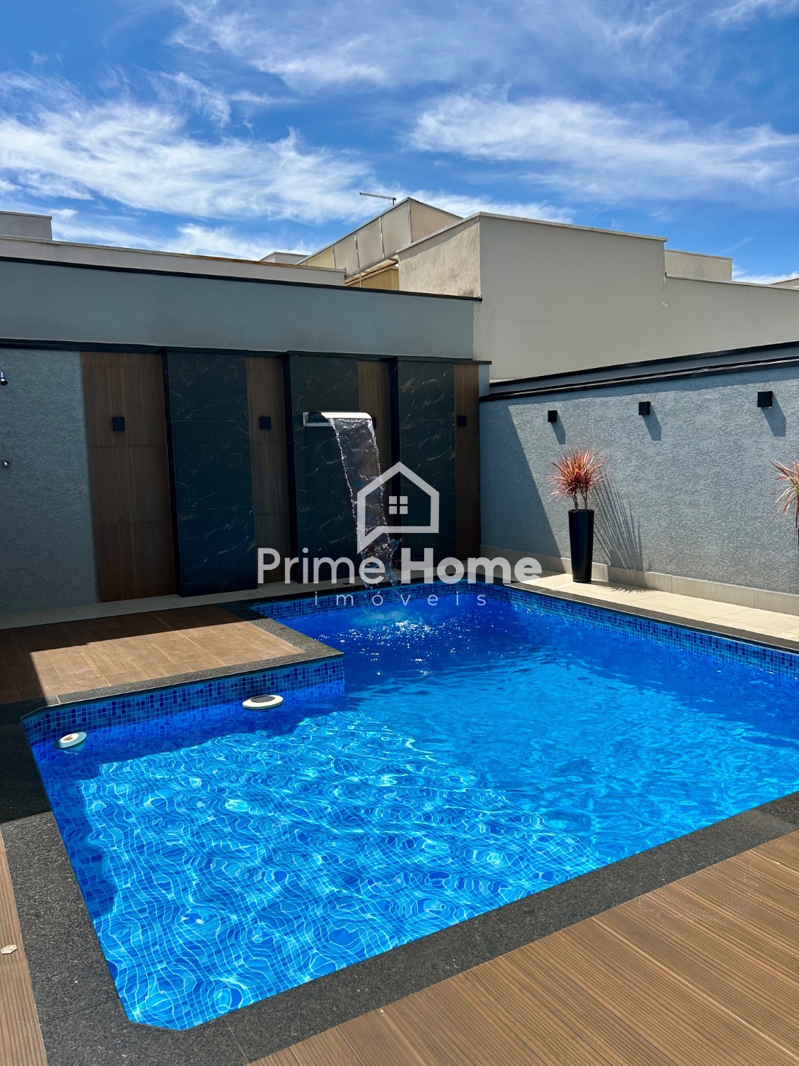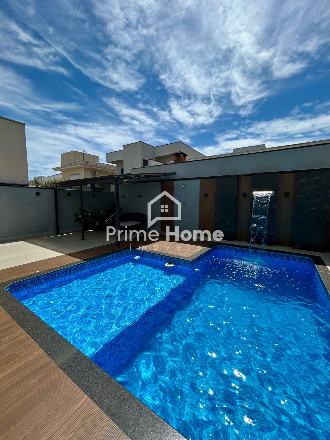 O banheiro social é completo e apresenta acabamento refinado. A lavanderia é discreta e funcional. O quintal é amplo, com um pergolado charmoso e uma piscina aquecida em vinil, com grande área de praia, hidromassagem, cascata e revestimentos decorativos.