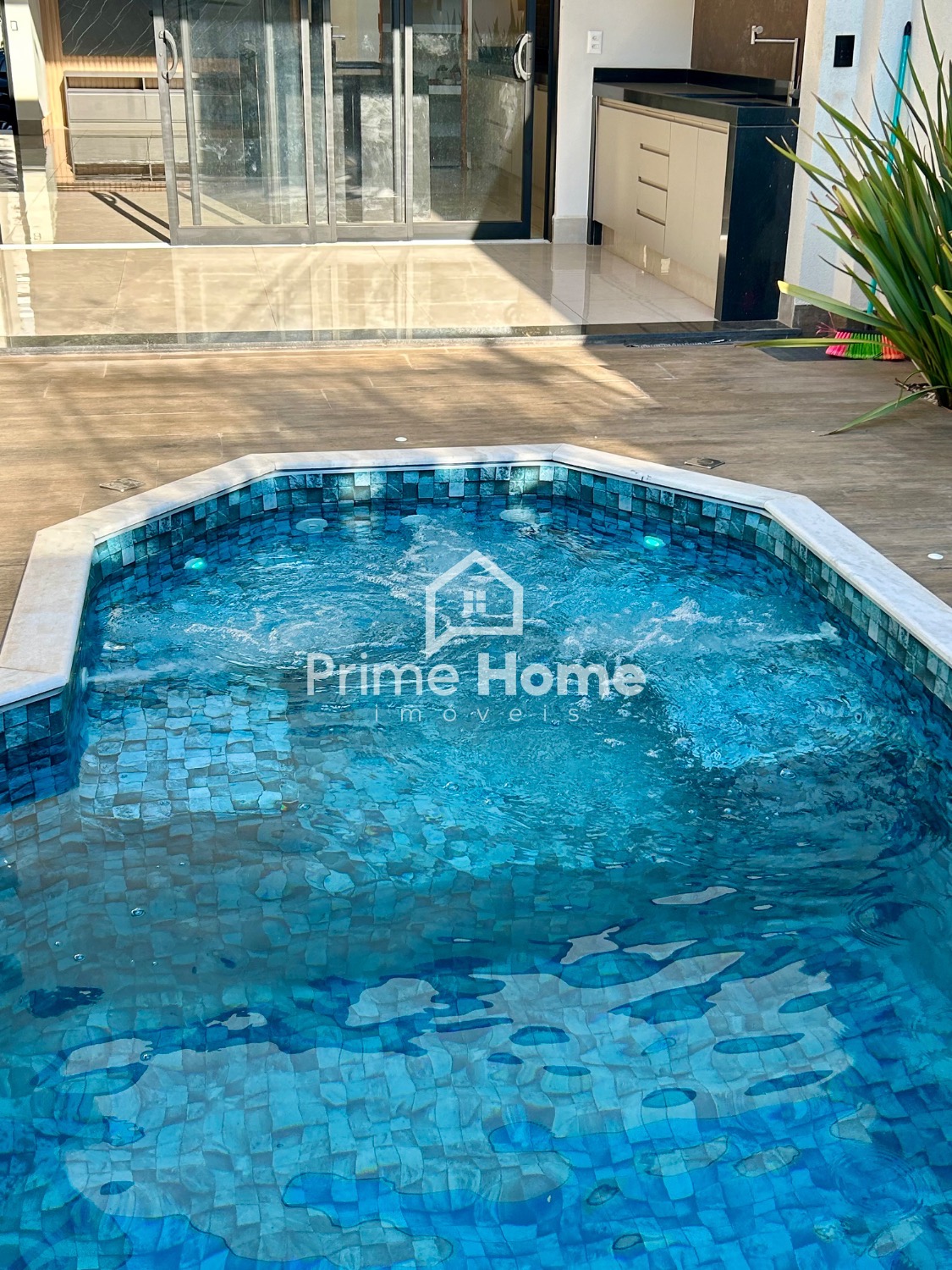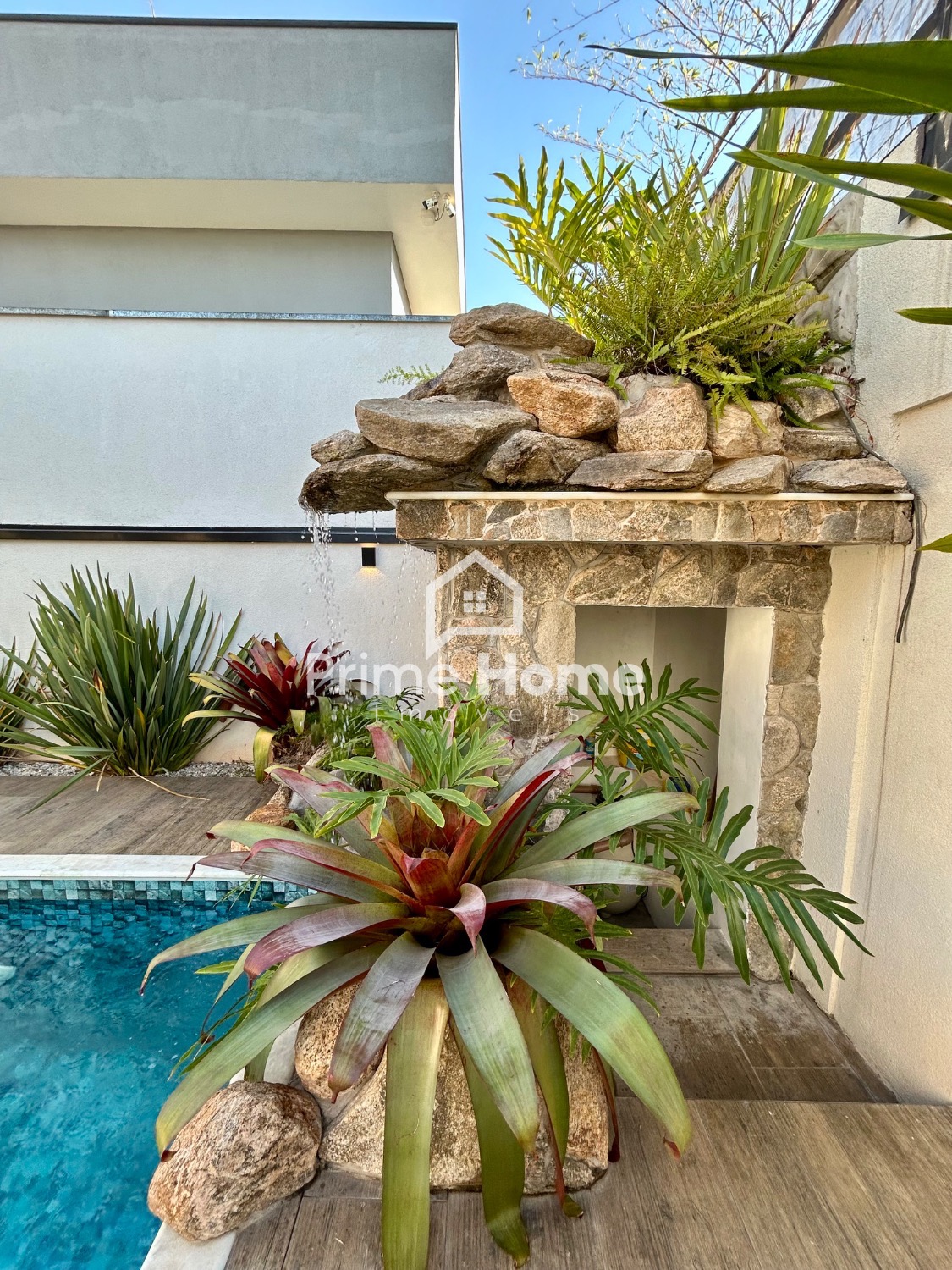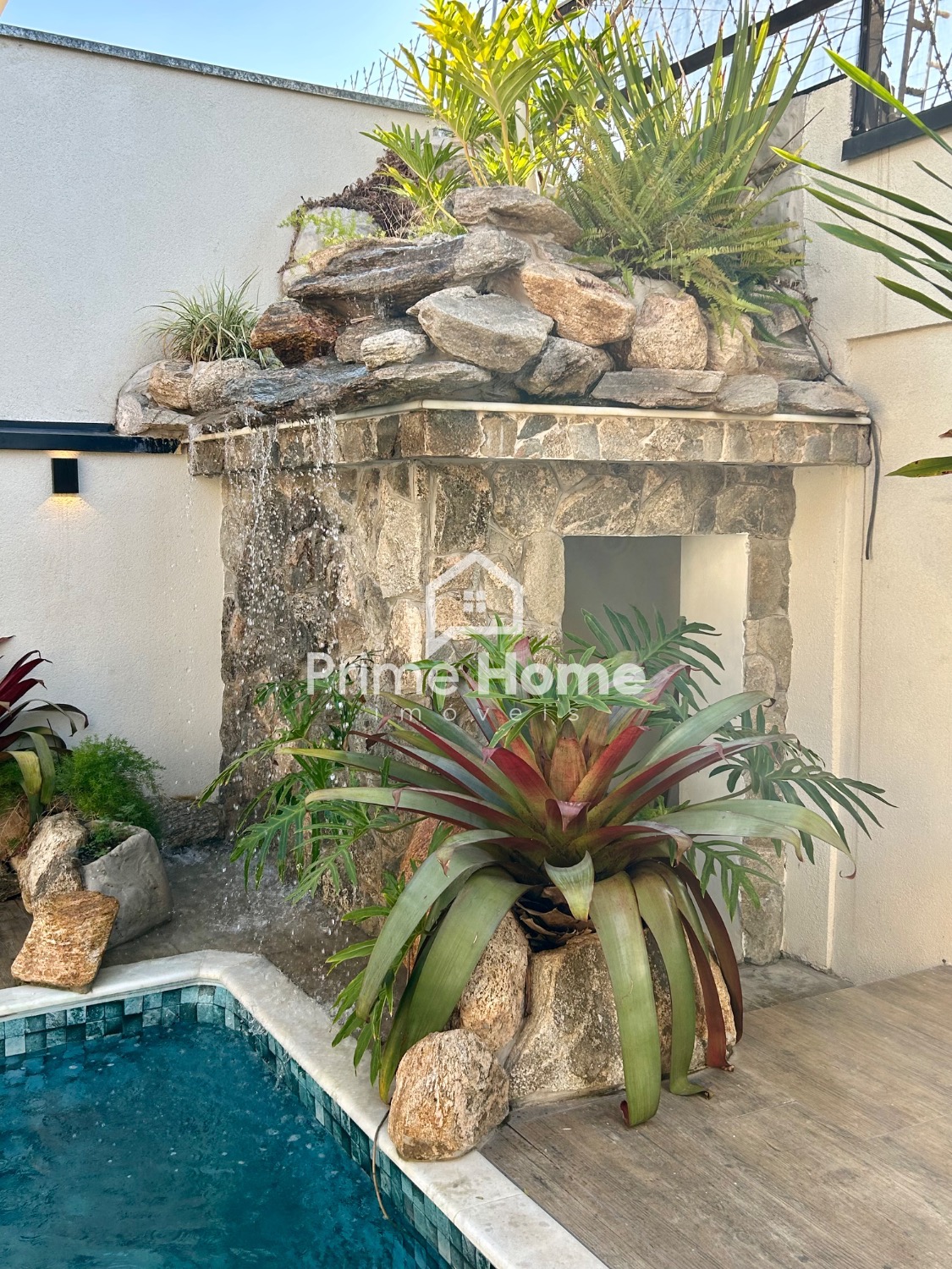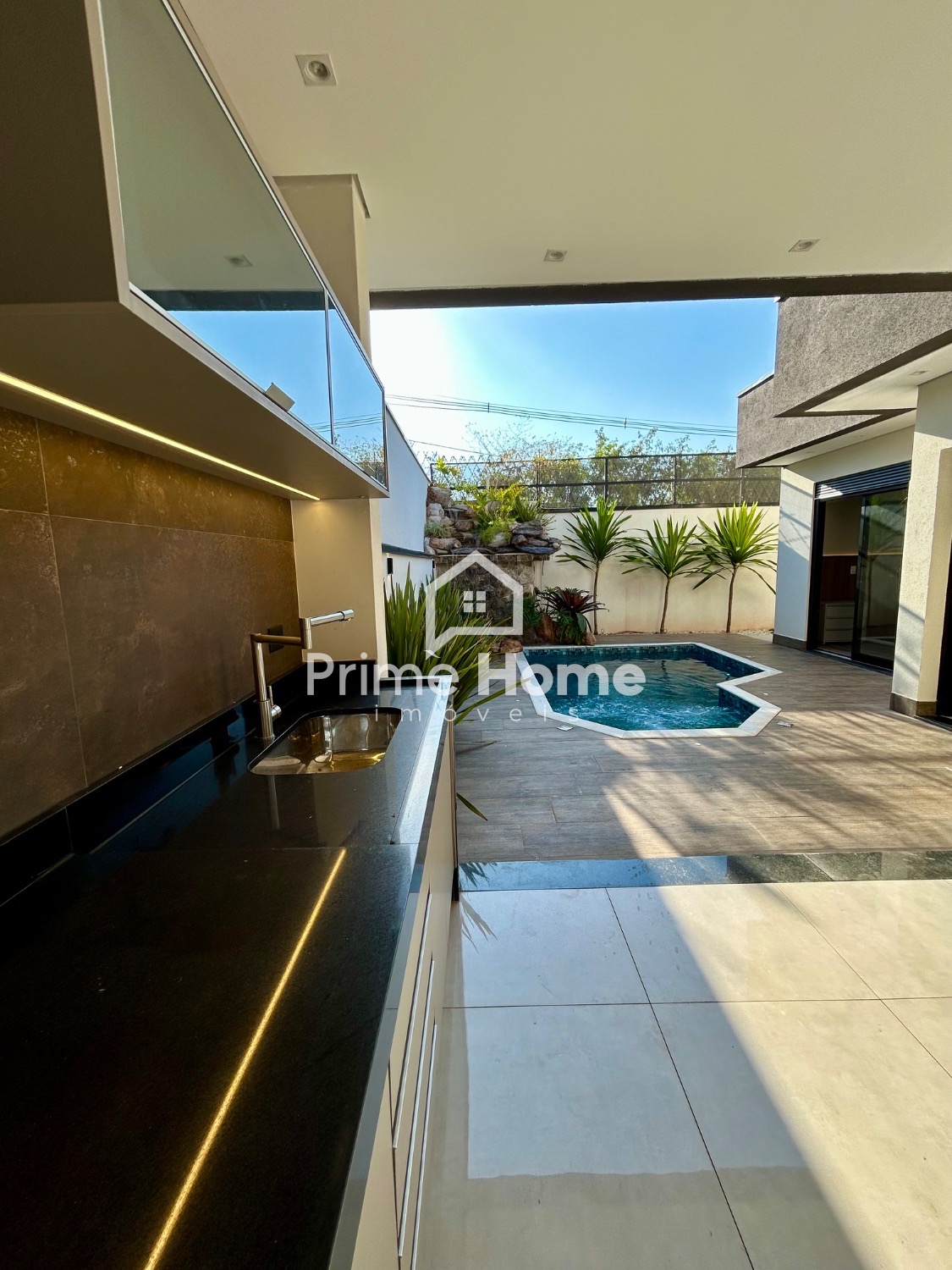 Para momentos de lazer e convivência, a casa dispõe de um espaço gourmet completo, com churrasqueira integrada à piscina com cascata, ideal para receber amigos e familiares com conforto. Há também um lavabo, que complementa os ambientes sociais com funcionalidade.