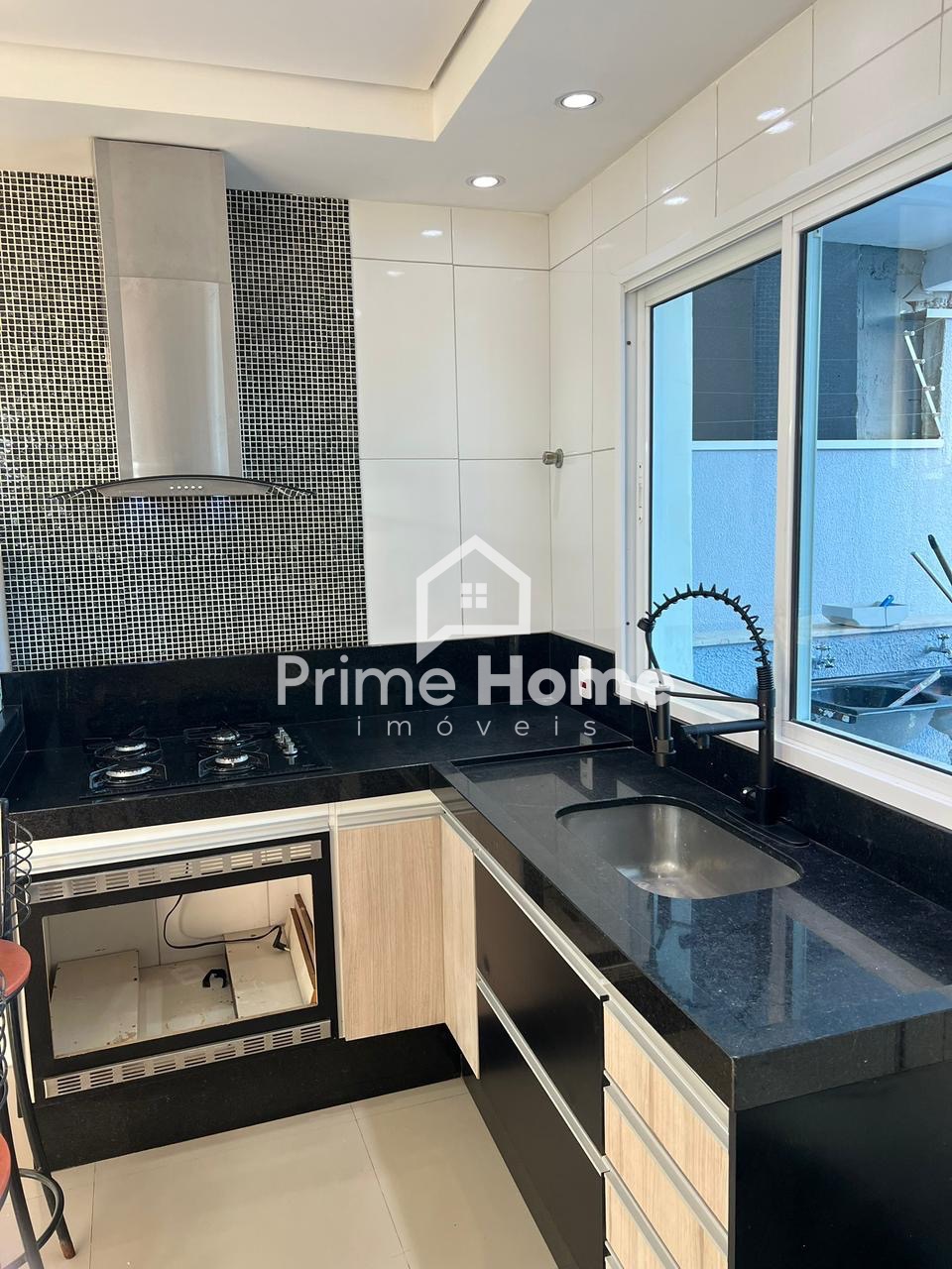 ●  cozinha-americana-com-bancada-e-banquetaluminaria-fogao-e-depurador-de-ar