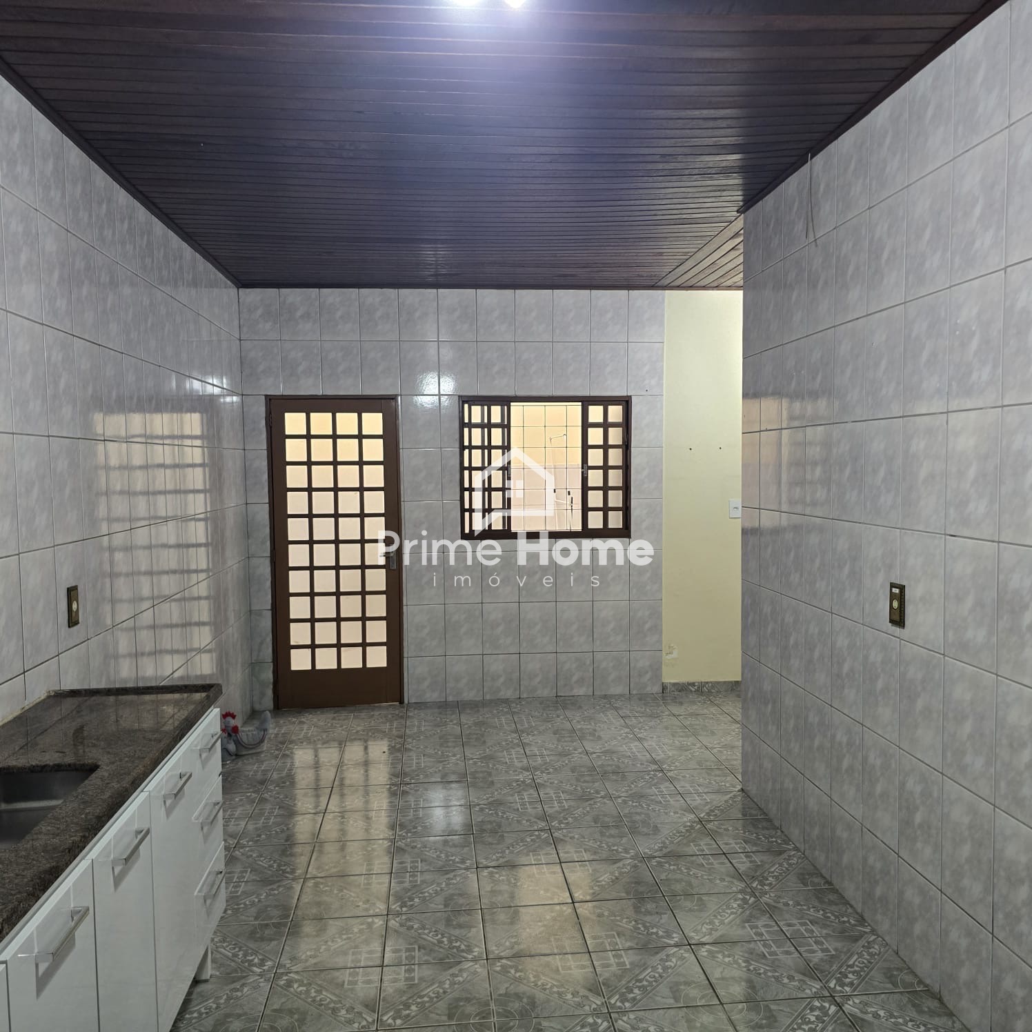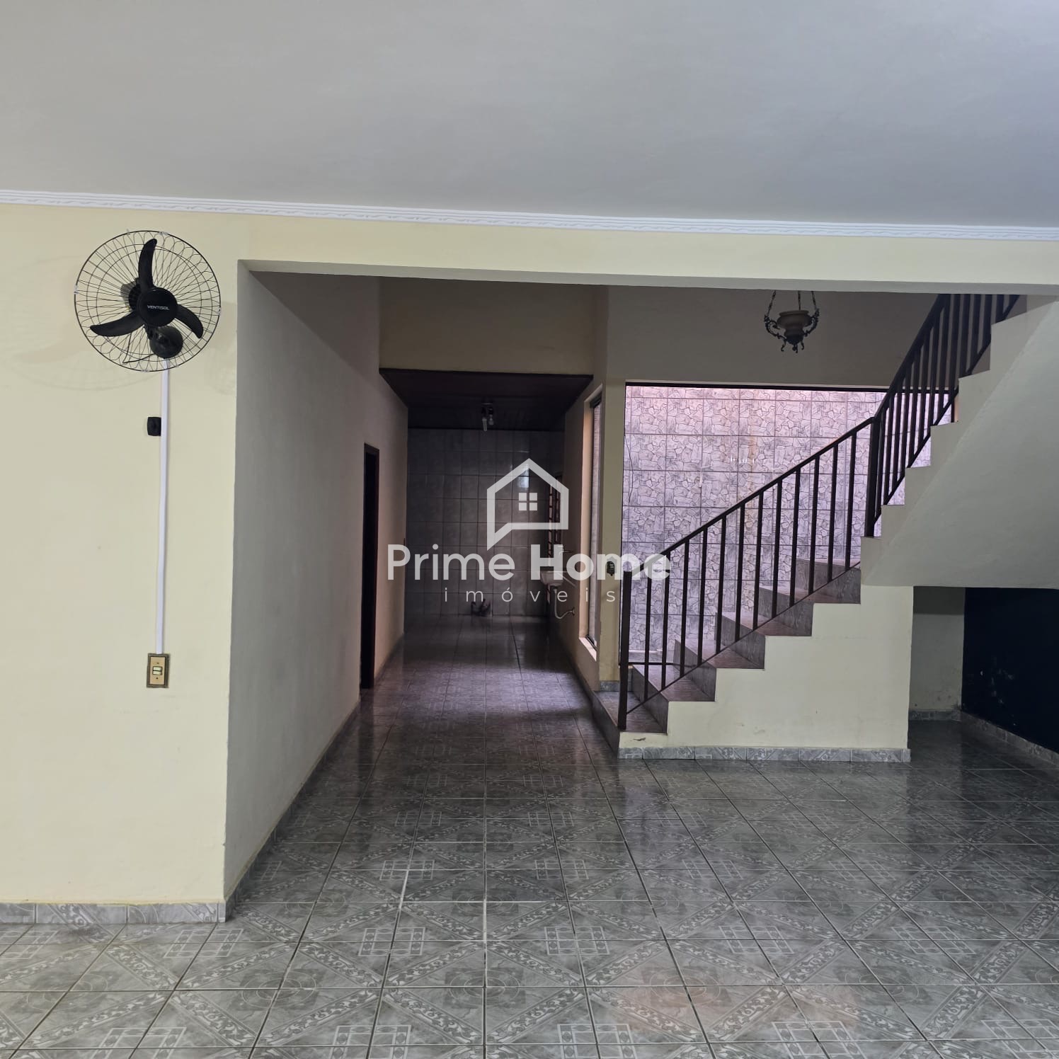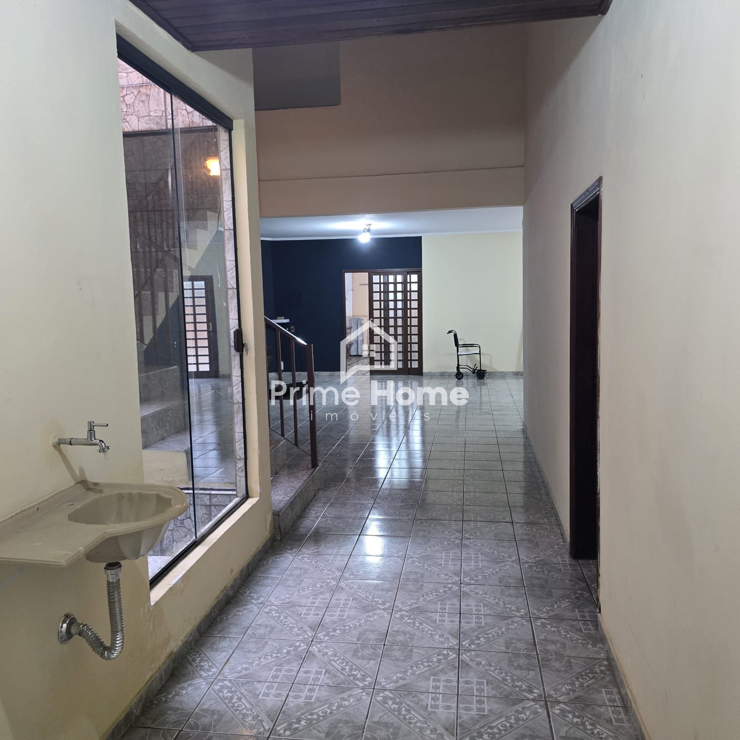 Andar inferior: salas amplas com 3 ambientes, jardim de inverno, 2 dormitórios sem armários, 1 banheiro social com box e gabinete, cozinha com gabinete e copa, lavanderia coberta e despensa ou guarda-volumes, área gourmet com churrasqueira e pia.