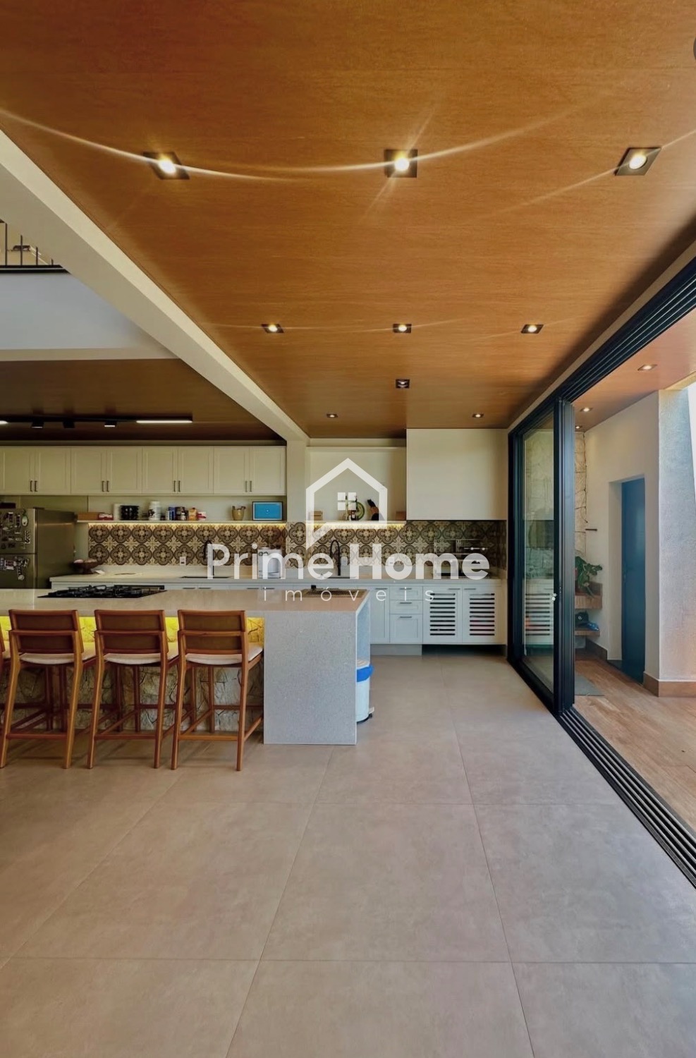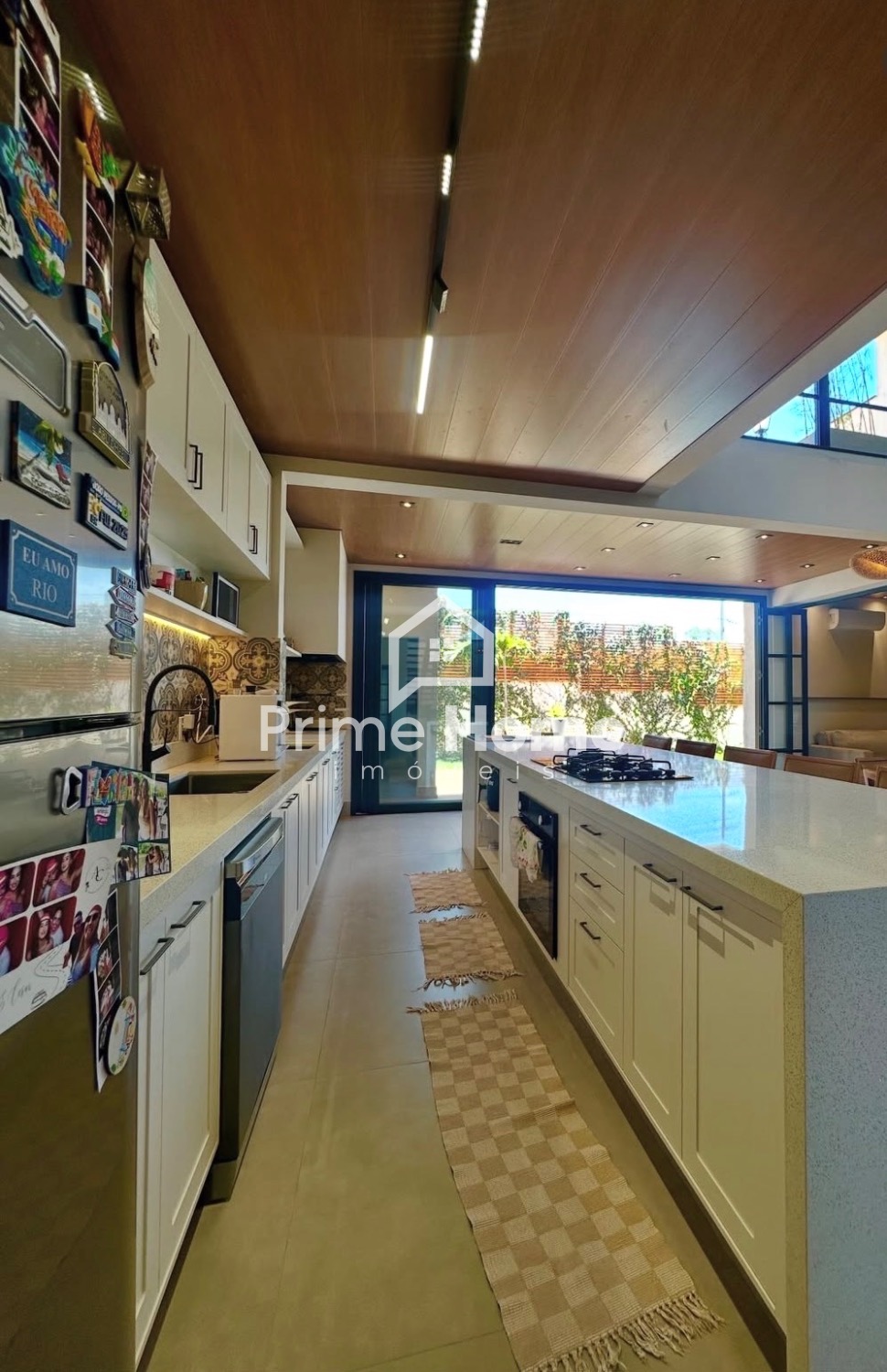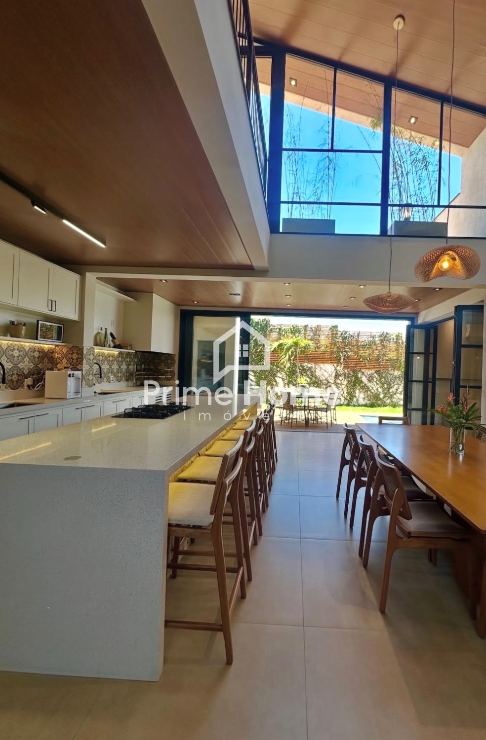 A cozinha é um dos grandes destaques do imóvel: uma imponente ilha de 4 metros em quartzo branco Stellar, com pia integrada, churrasqueira Dnoxx a gás e móveis Simonetto, criando um ambiente perfeito para receber e viver bons momentos.