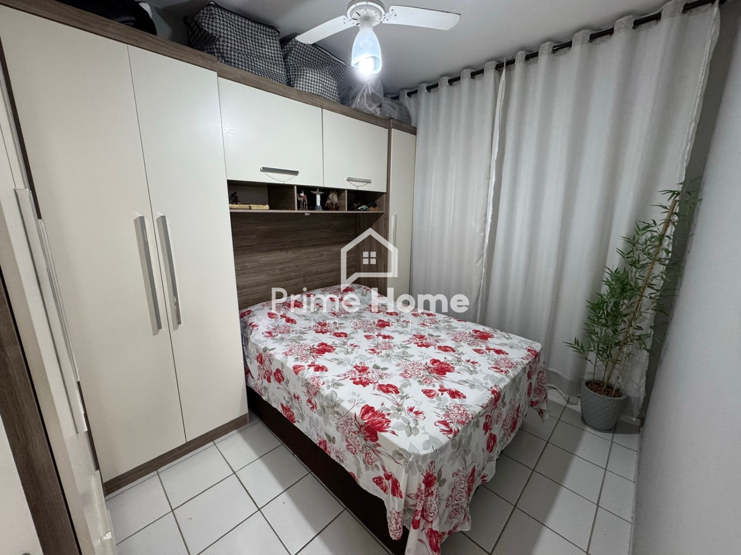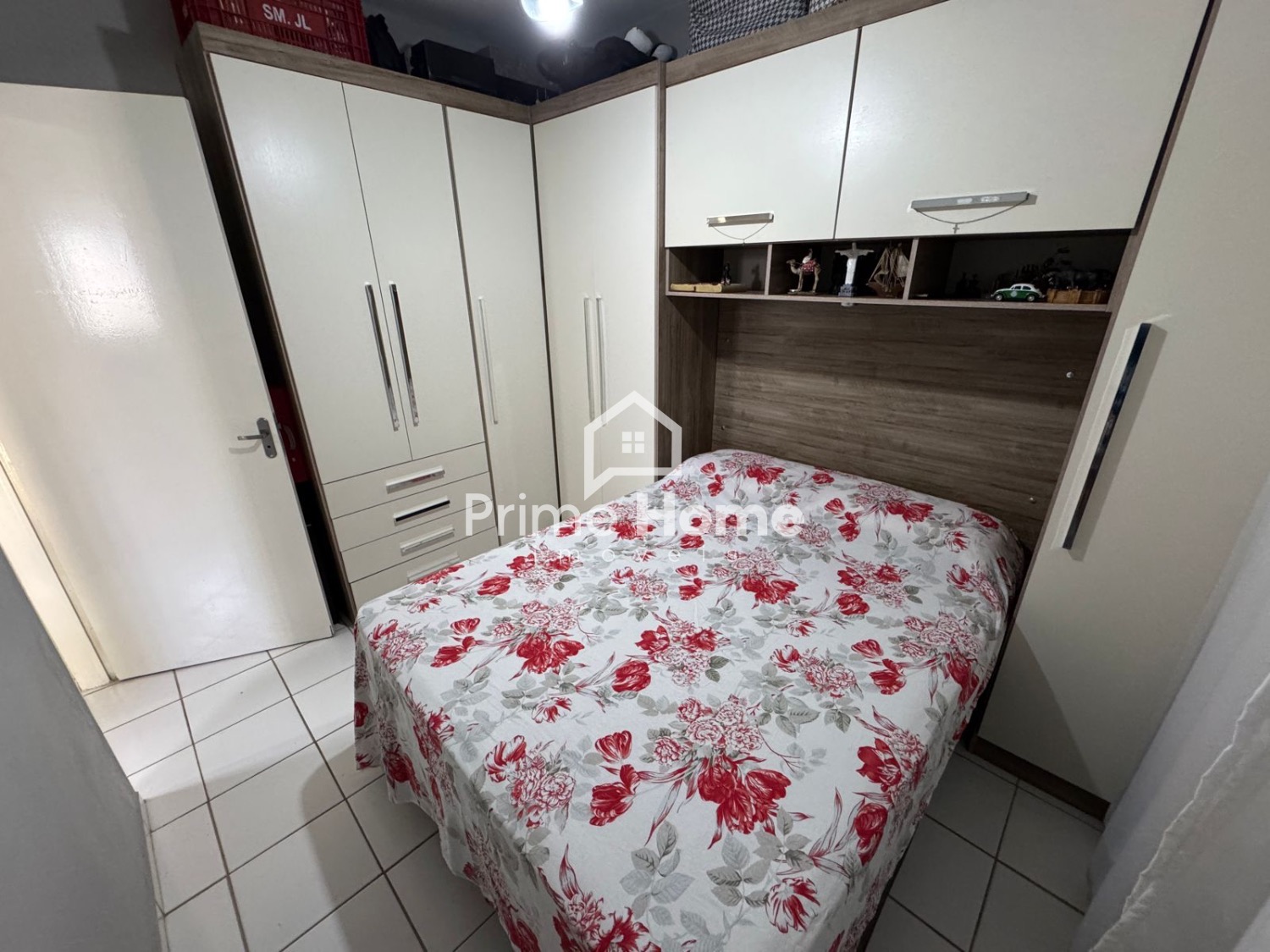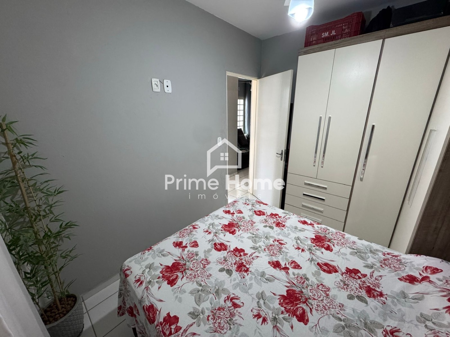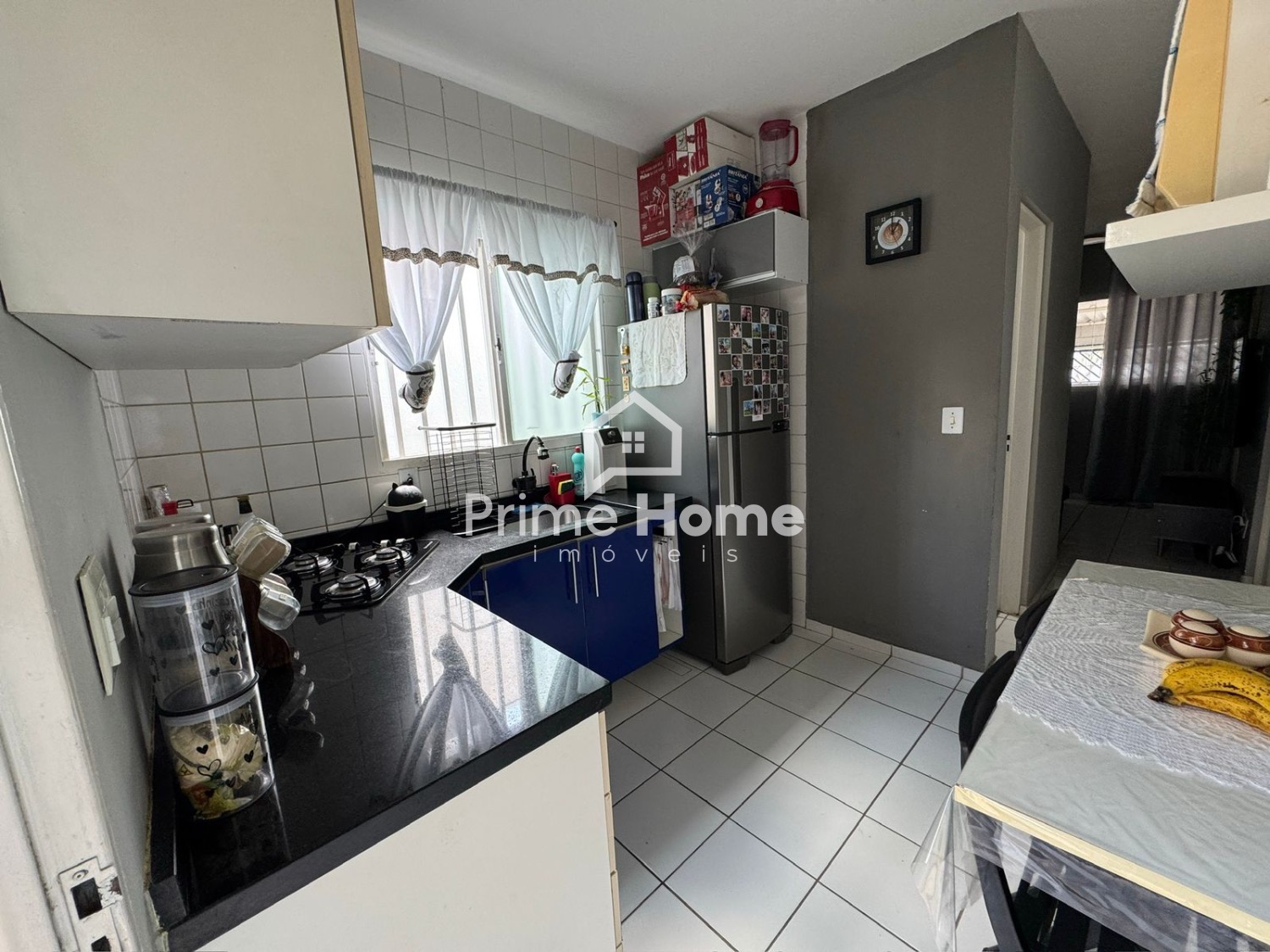 A sala de estar conta com sofá, TV e itens de decoração, criando um ambiente aconchegante e harmonioso. São 2 dormitórios bem distribuídos, com guarda-roupas completos. O banheiro social é completo e possui decoração equilibrada. A cozinha é funcional, equipada com armários planejados, fogão e geladeira. O imóvel dispõe de 1 vaga coberta para carro e espaço para 1 moto.