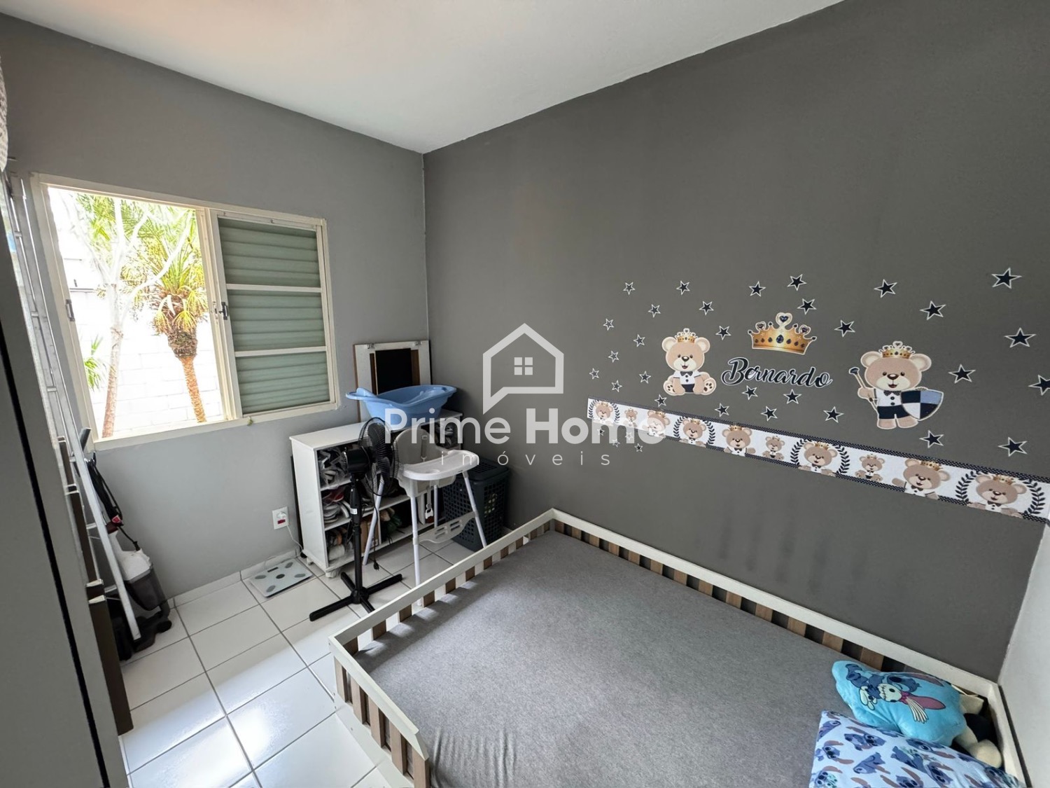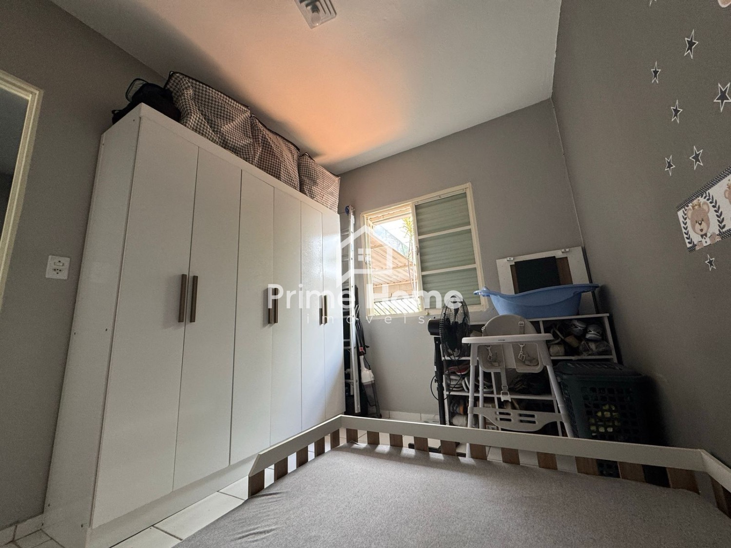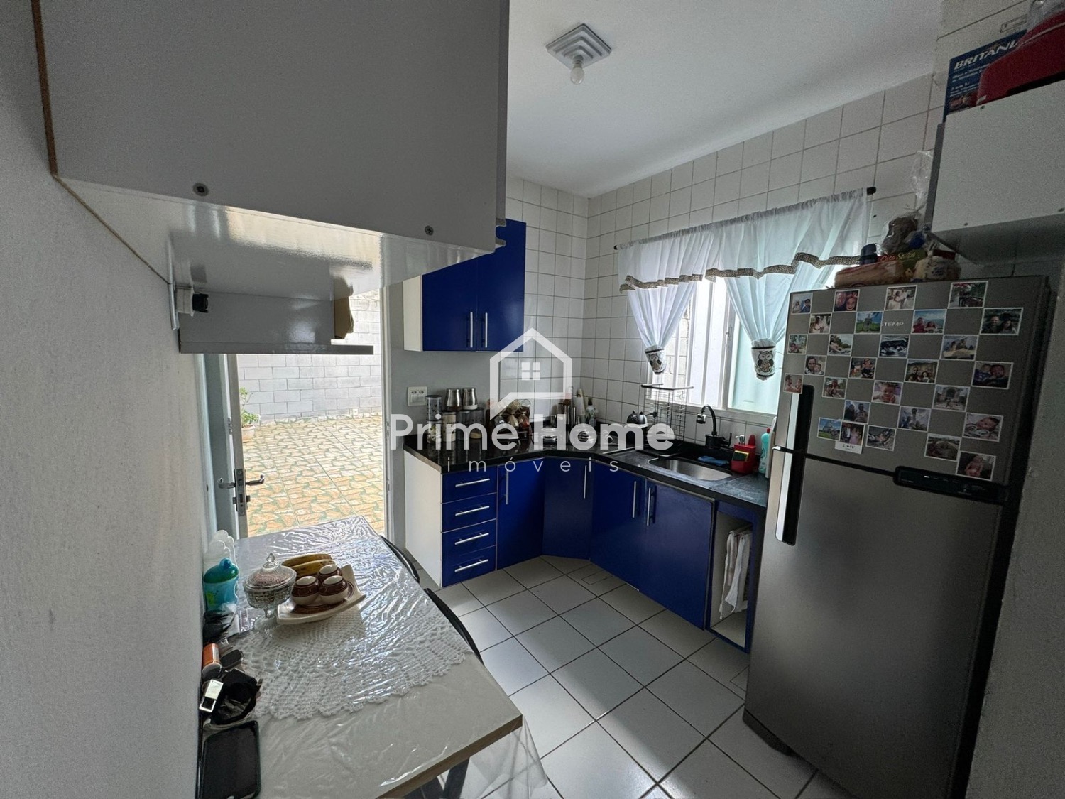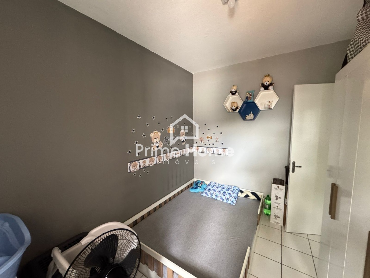 A sala de estar conta com sofá, TV e itens de decoração, criando um ambiente aconchegante e harmonioso. São 2 dormitórios bem distribuídos, com guarda-roupas completos. O banheiro social é completo e possui decoração equilibrada. A cozinha é funcional, equipada com armários planejados, fogão e geladeira. O imóvel dispõe de 1 vaga coberta para carro e espaço para 1 moto.