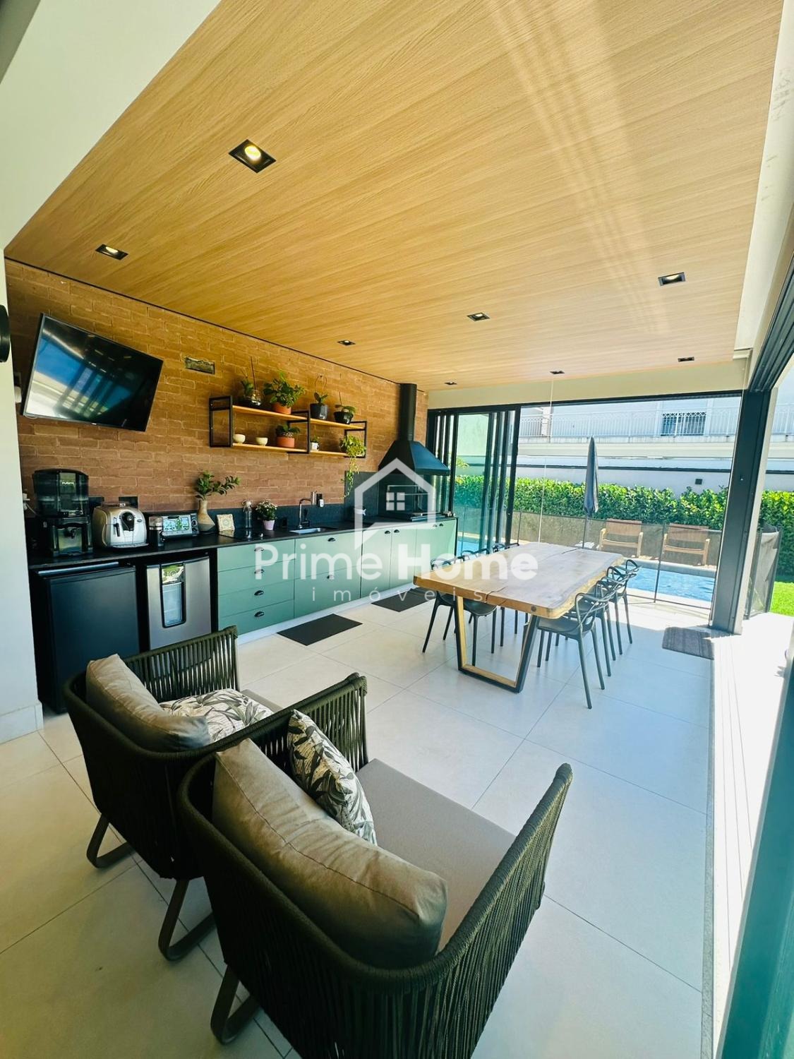 No piso superior, os ambientes sociais se destacam pela integração e elegância, com sala de estar com lareira a lenha, sala de TV e sala de jantar, além de cozinha funcional e espaço gourmet com churrasqueira a carvão. Conta ainda com despensa, lavanderia e banheiro de apoio, oferecendo praticidade no dia a dia.