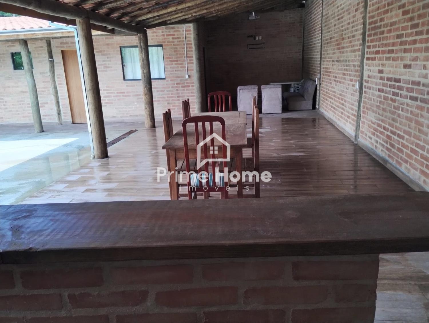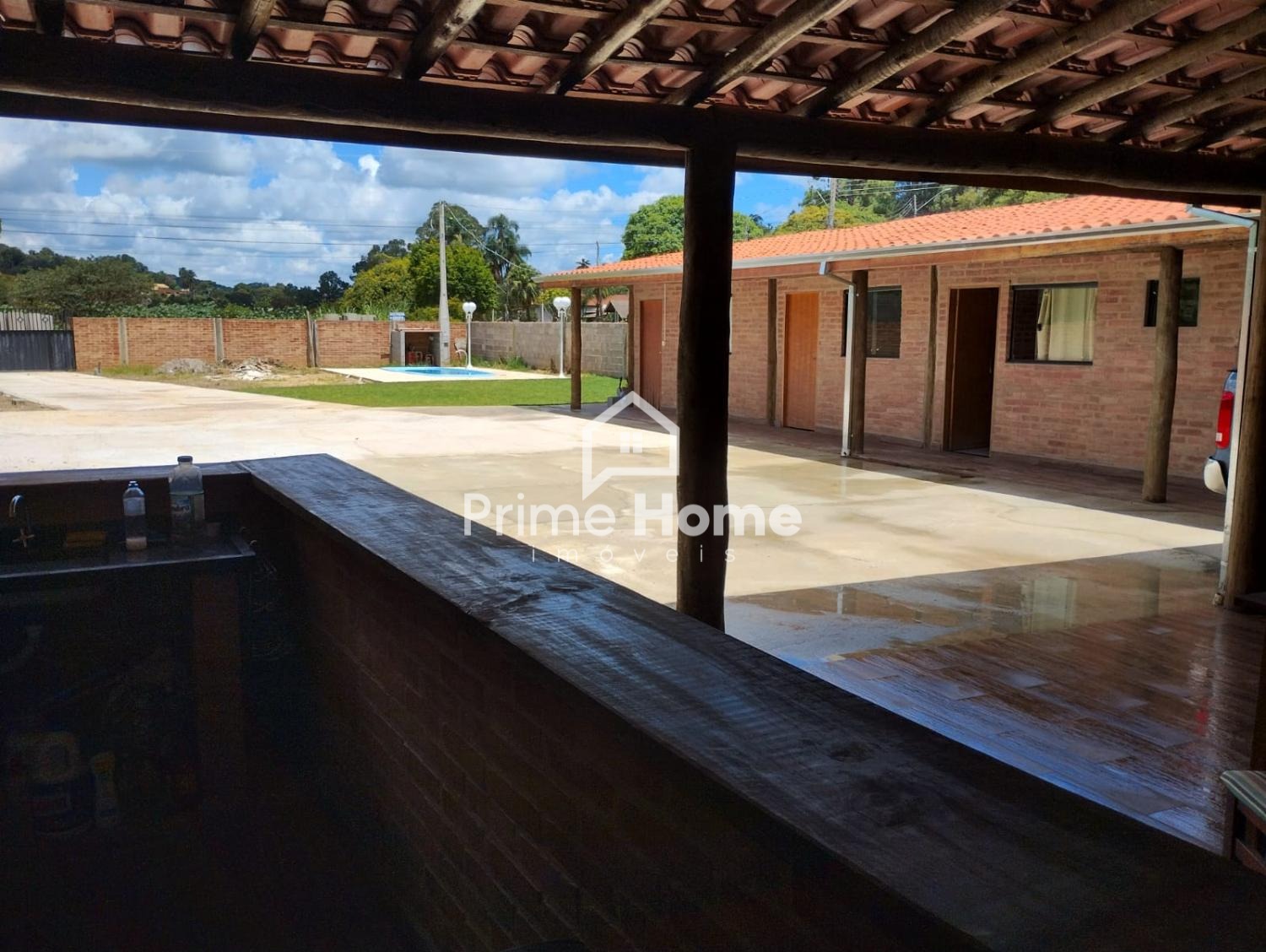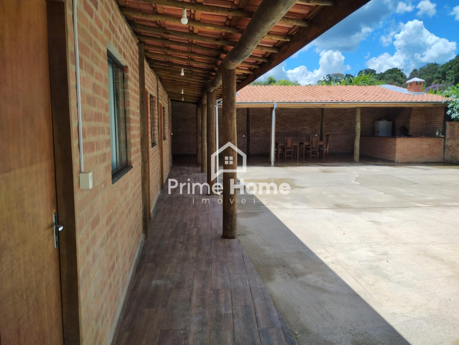 A chácara conta com 4 dormitórios, sendo 3 suítes, sala de TV, cozinha caipira, área de lazer coberta com churrasqueira e piscina. A construção é em tijolinho aparente, com estrutura de eucalipto tratado, garantindo charme e durabilidade.