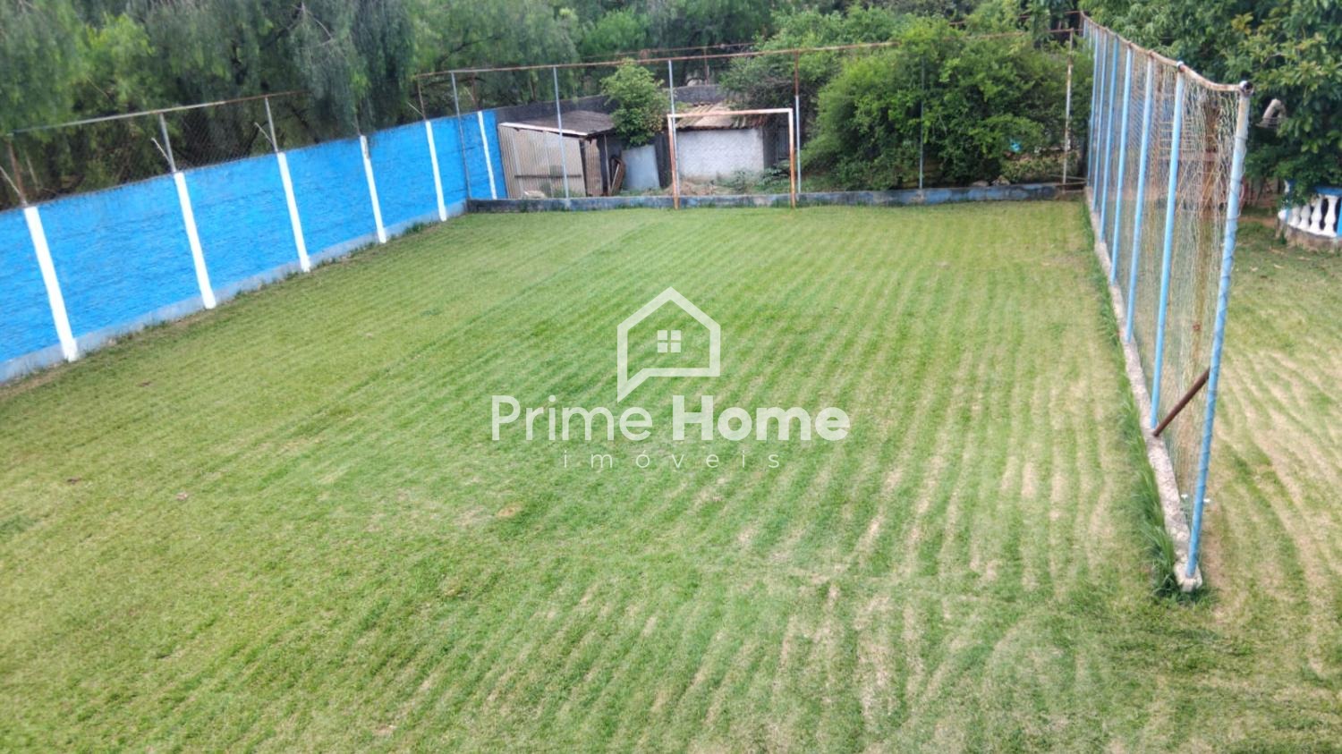 Campo gramado e cercado (10x7 metros), ótimo para esportes e recreação.