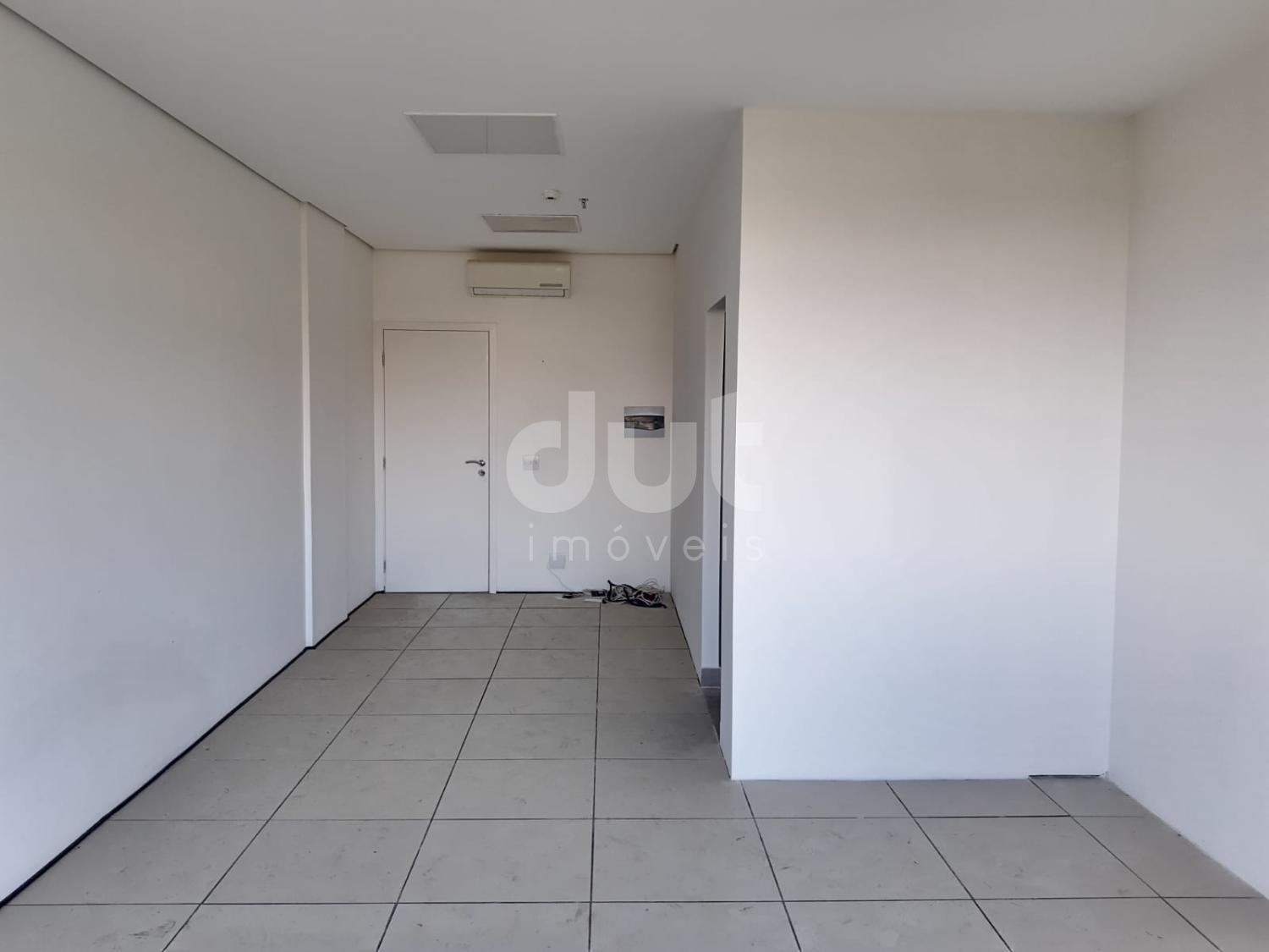 Sala comercial com 33 m² com ar condicionado, piso elevado luminárias, persianas e sacada.