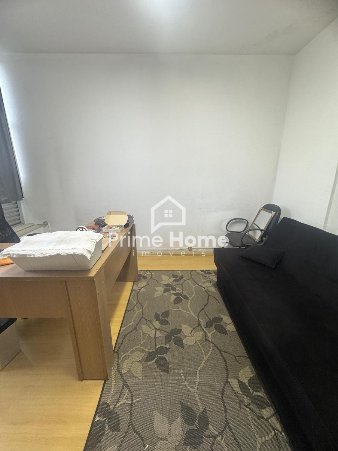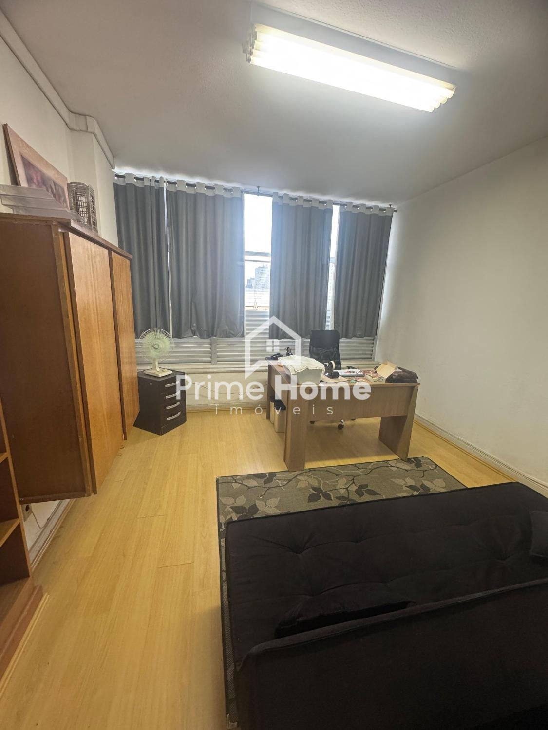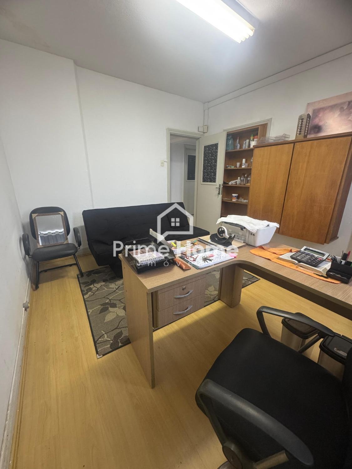 Sala comercial de 16 m², equipada com piso laminado, armário, mesa de escritório, cadeiras, sofá e acesso a banheiro coletivo. Não conta com vaga de estacionamento.
