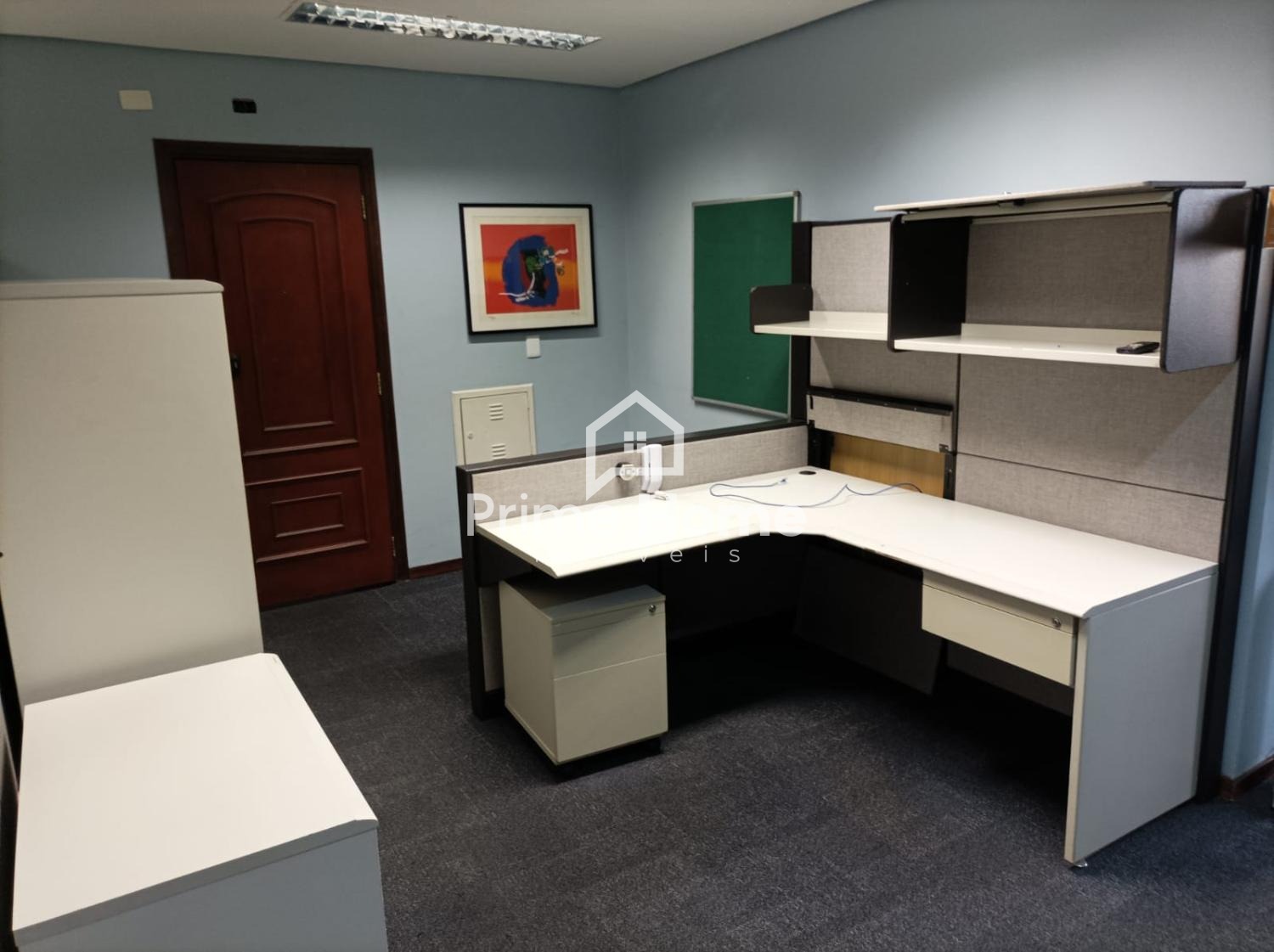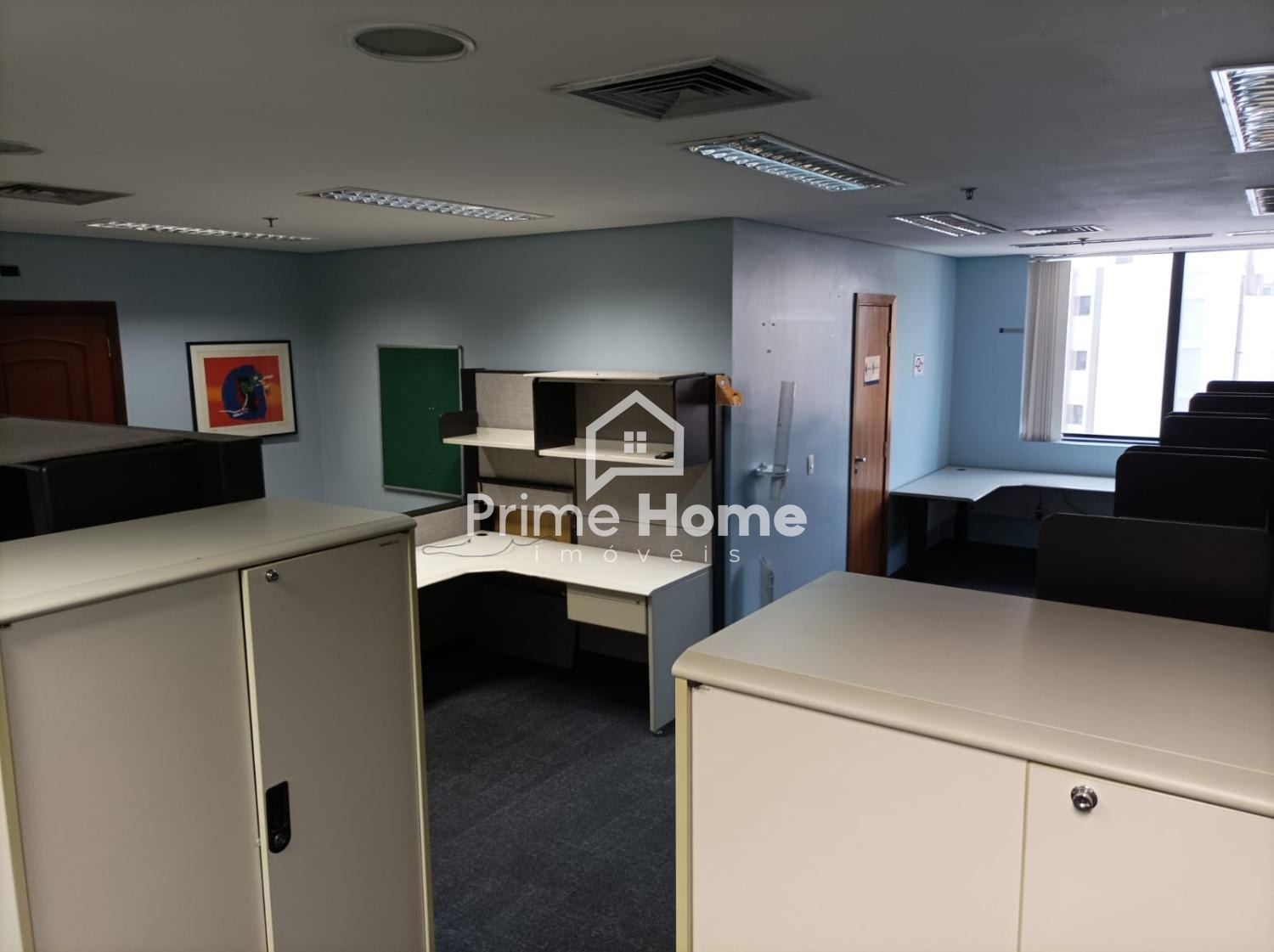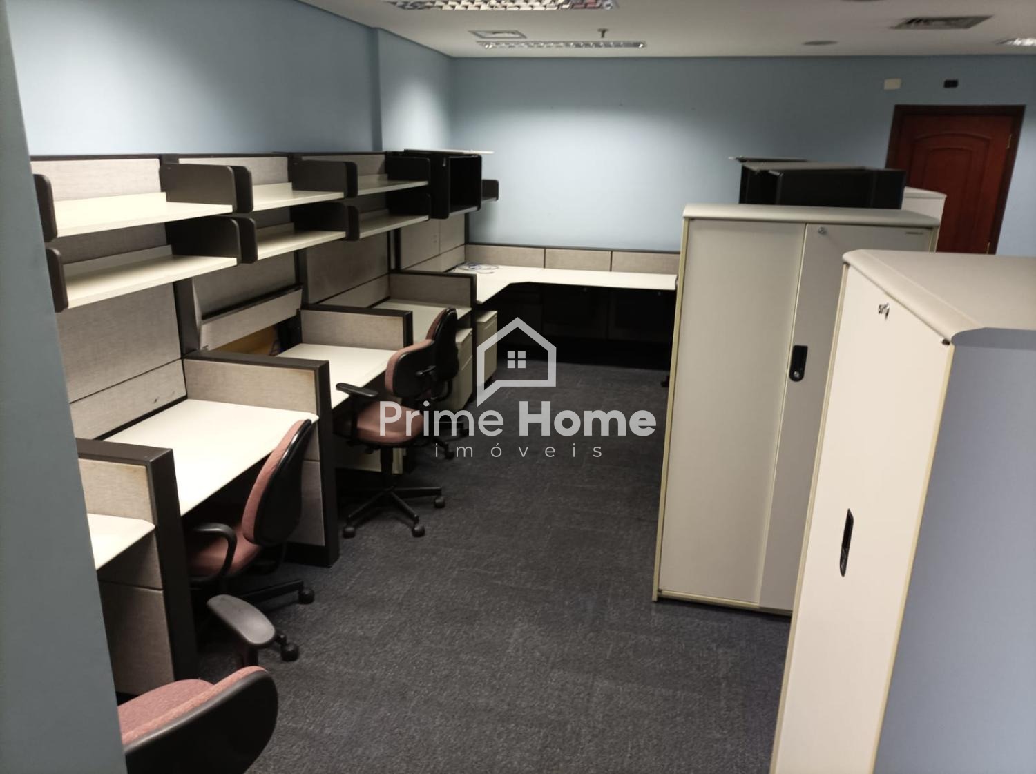 Sala comercial de alto padrão, com estação de trabalho, cadeiras, mesas planejadas em todas as salas, rica em armários, 3 banheiros, servidor e 2 vagas de garagem.