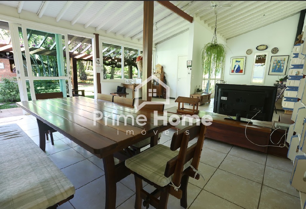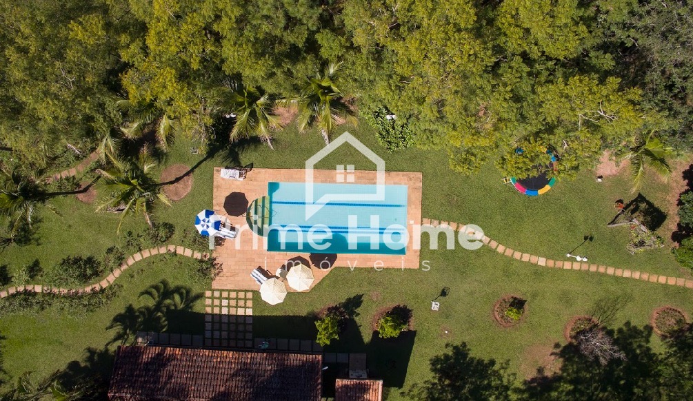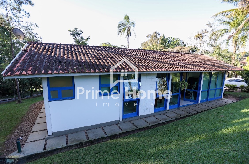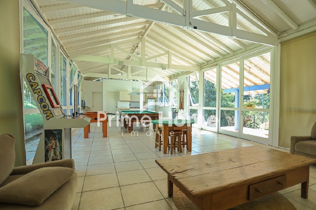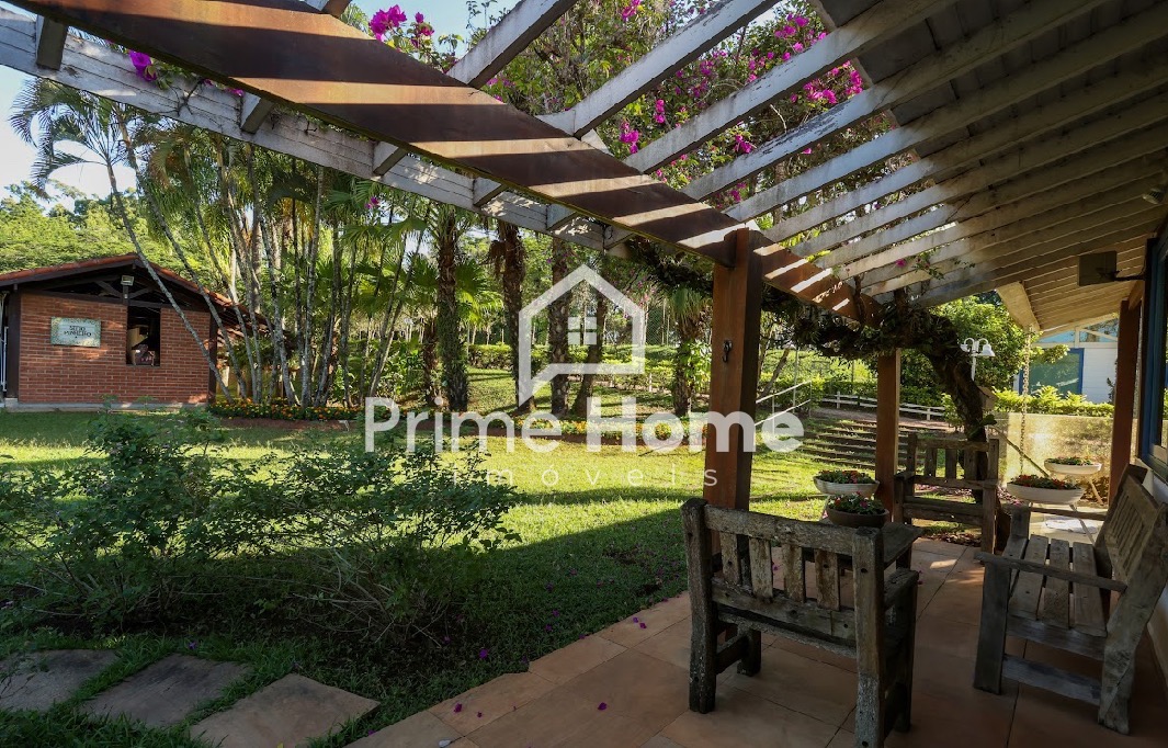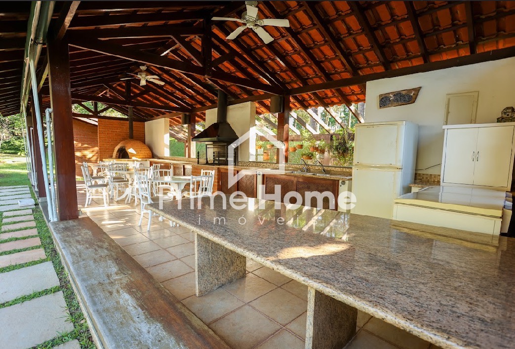 A casa principal conta com 4 suítes, lavabo, amplas salas de estar e jantar integradas à cozinha planejada, área de serviço, varandas e pergolado. A propriedade oferece estrutura de lazer completa, incluindo salão de festas com mini-cozinha, espaço gourmet à beira da piscina com churrasqueira profissional e forno de pizza, piscina, campo de futebol society (grama natural), quadra poliesportiva e pista de skate em formato bowl.