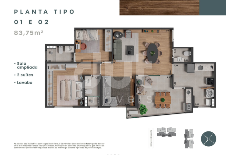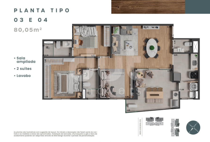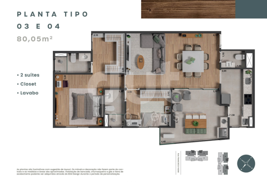 | Apartamento tipo 1 com 80,05 m², 2 suítes com lavabo, varanda gourmet | |