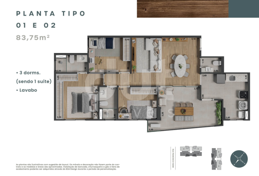 | Planta de 83,75 m² com 3 dormitórios e 1 suíte ou 2 suítes, 2 vagas, varanda gourmet. |